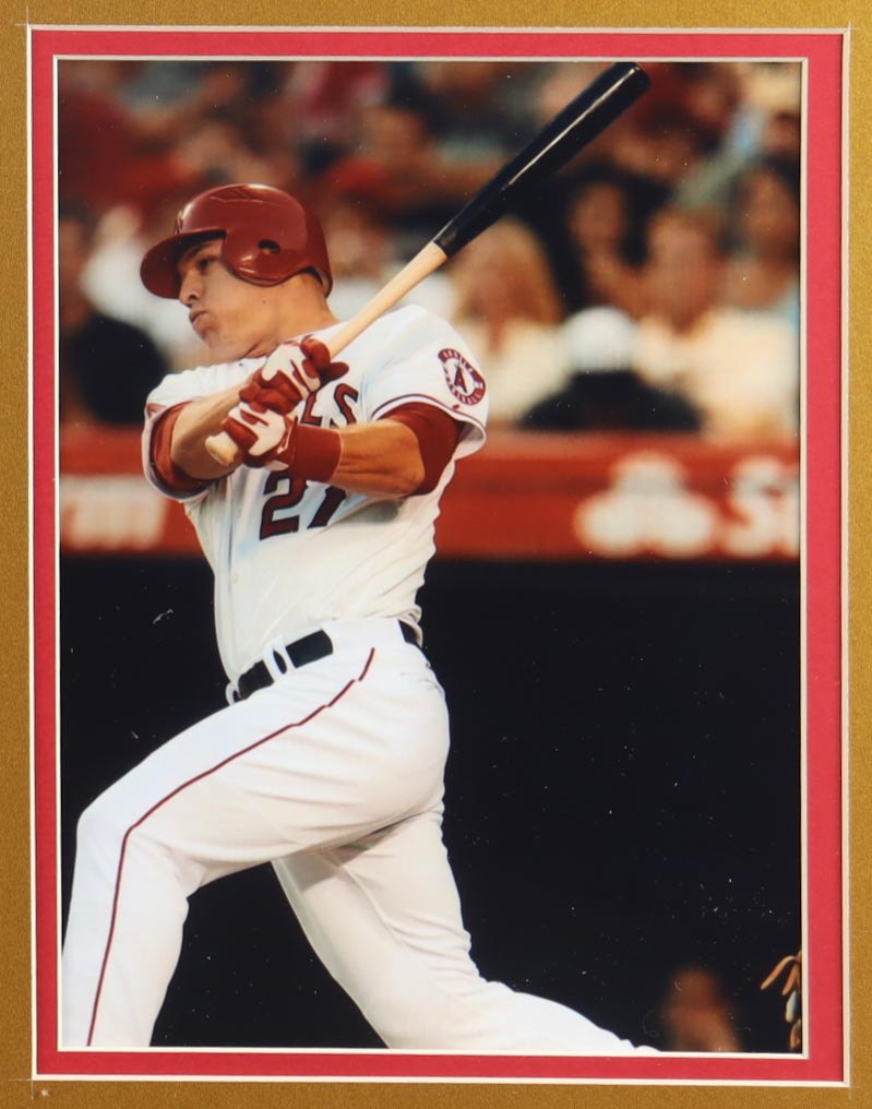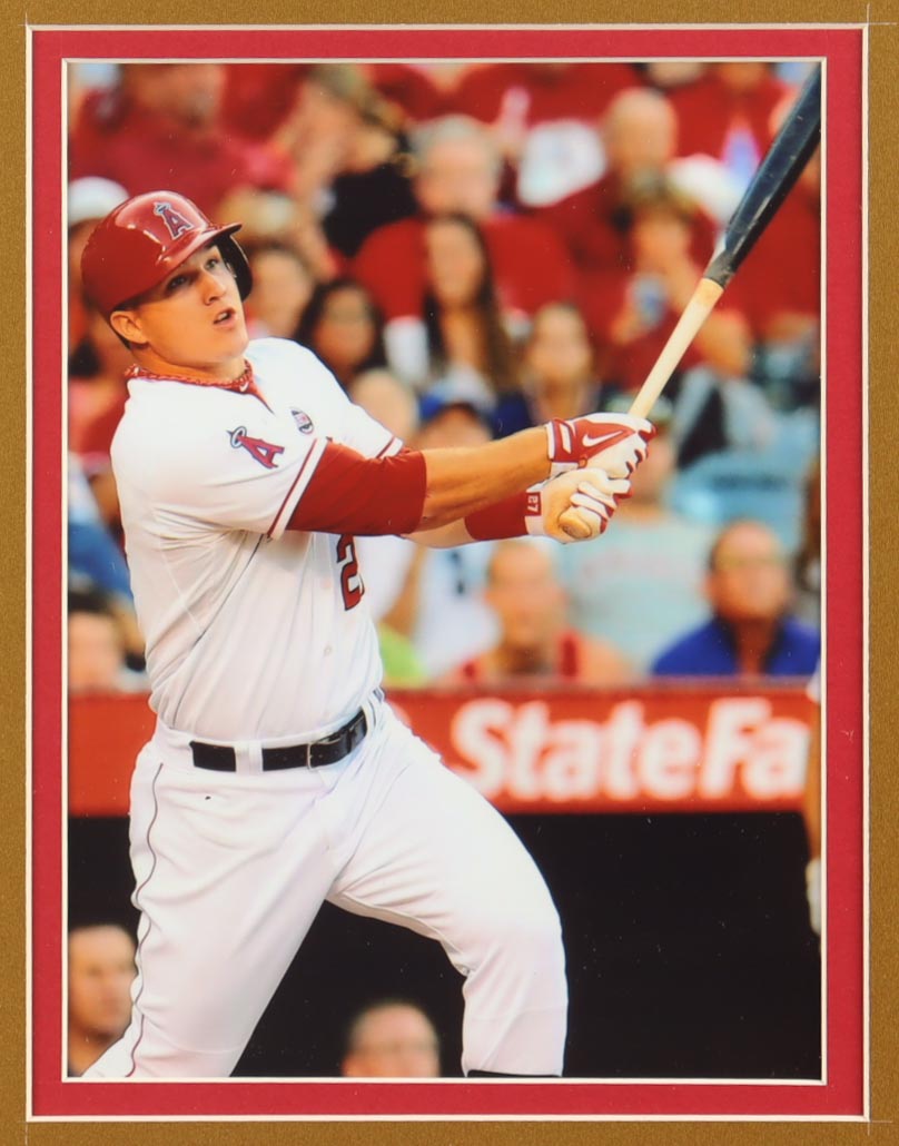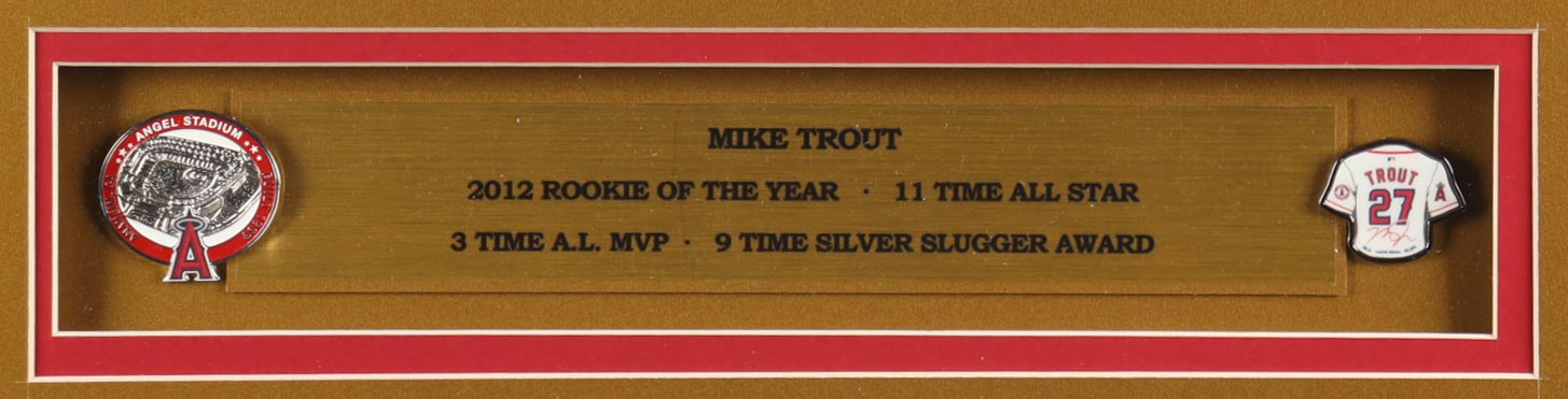 Custom frame display measures approximately 32" x 36" in size and features a jersey of Mike Trout (Los Angeles Angels). The display also includes (2) logo pins, (2) photos, (2) cloth logo patches and career statistics plaque. Please note that the item is unsigned.