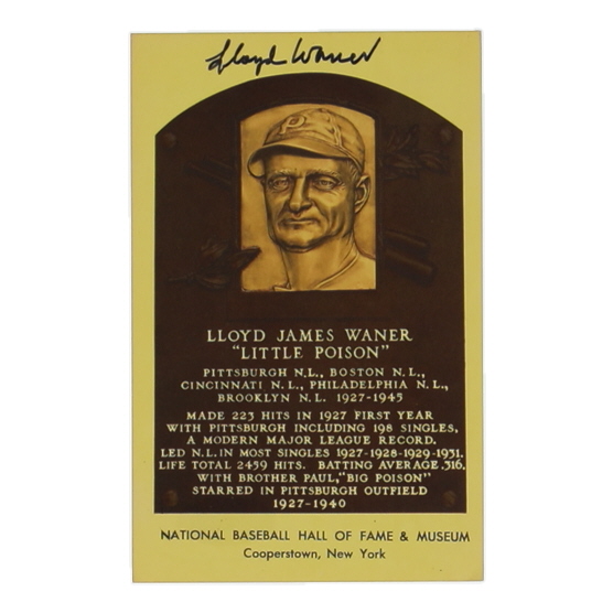 Hall of Fame Plaque Postcard has been hand-signed by Lloyd Waner (D. 1982, Pittsburgh Pirates, HOF).
