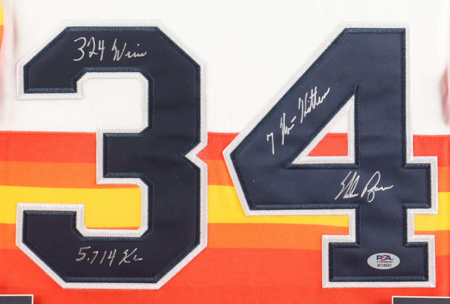 Nolan Ryan Signed Custom Framed Jersey Display Inscribed "324 Wins" & "7 No-Hitters" & "5,714 K's" with Hall of Fame Pin (PSA)