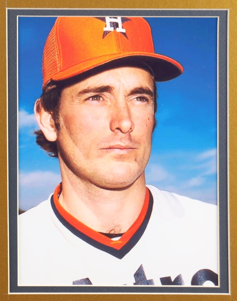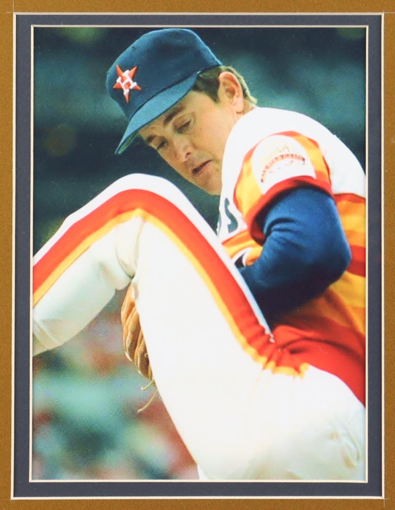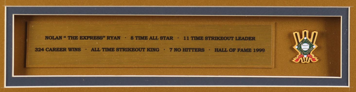 Custom frame display measures approximately 32" x 36" in size and features a jersey that has been hand-signed and inscribed by Nolan Ryan (Houston Astros, HOF). The display also includes a National Baseball Hall of Fame pin, (2) photos and (2) cloth team logo patches and a career statistics plaque.