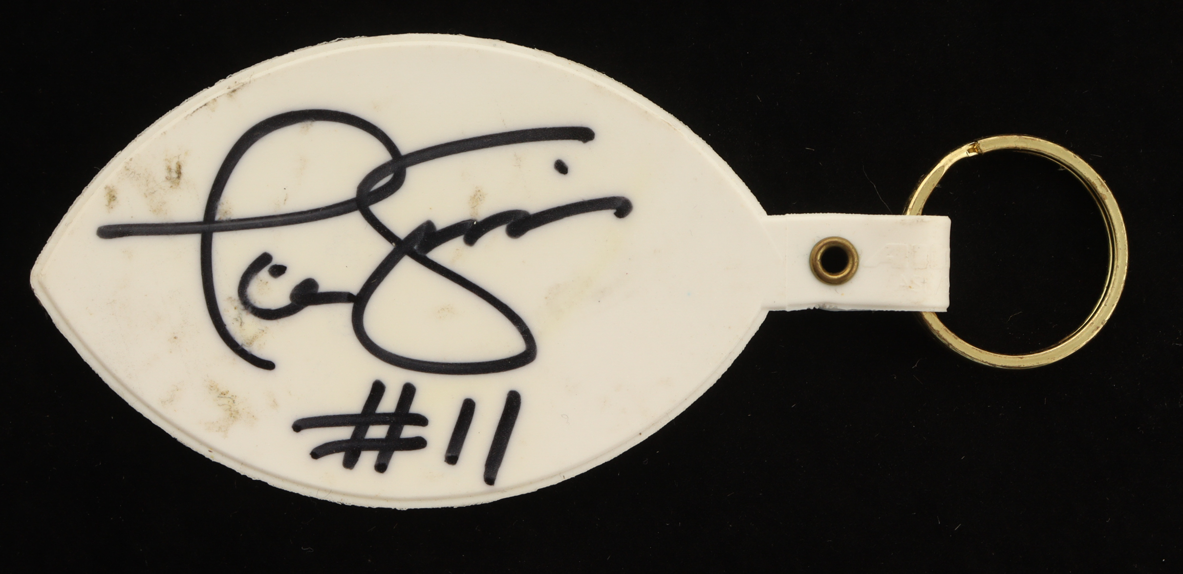 Riddell New York Giants keychain has been hand-signed by Phil Simms. Please note, there is scuffing and staining on the keychain.