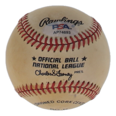 Rawlings Official National League baseball has been hand-signed by Leo Durocher (D. 1991, Brooklyn Dodgers, HOF). Please note, the baseball is stained and naturally toned.