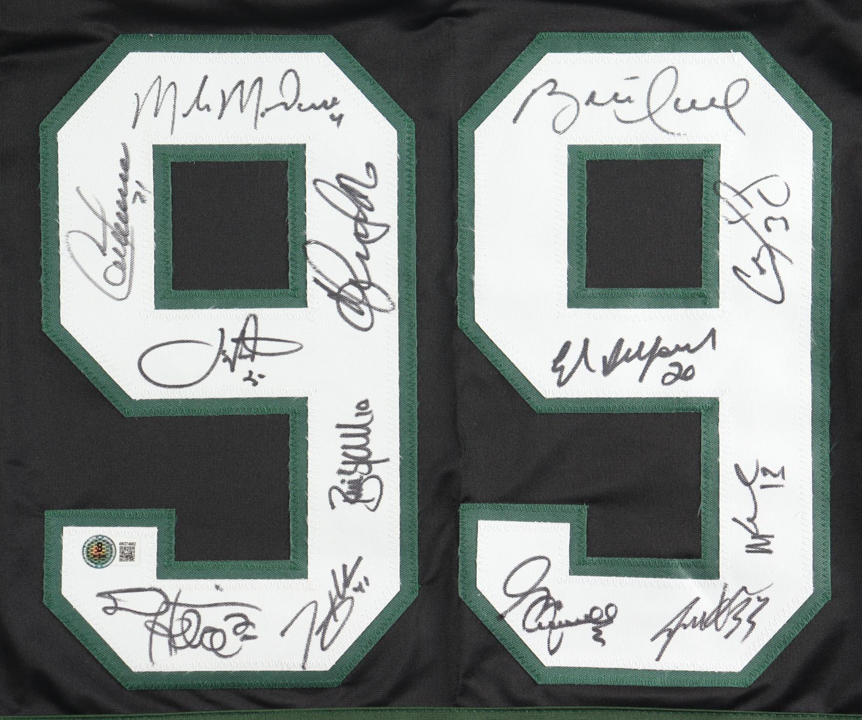Custom jersey with everything sewn on, size XL. Hand-signed by (13) including Mike Modano (HOF), Brett Hull (HOF), Ed Belfour (HOF), Guy Carbonneau (HOF), Brian Skrudland, Derian Hatcher, Joe Nieuwendyk (HOF), Sergei Zubov (HOF), Craig Ludwig, Benoit Hogue, Tony Hrkac, Grant Marshall and Mike Keane.
