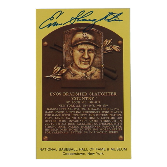 Hall of Fame Plaque Postcard has been hand-signed by Enos Slaughter (D. 2002, St. Louis Cardinals, HOF).