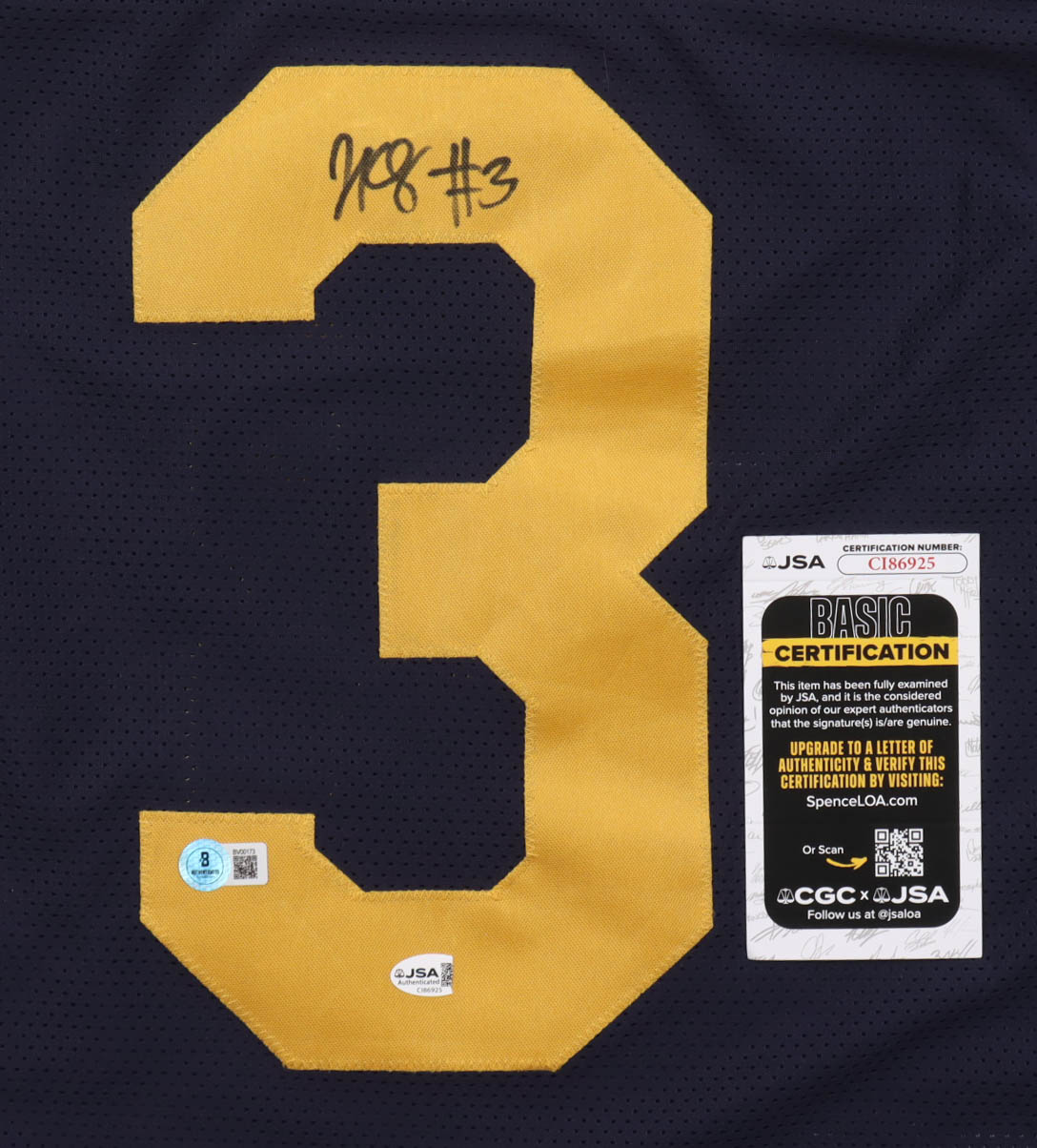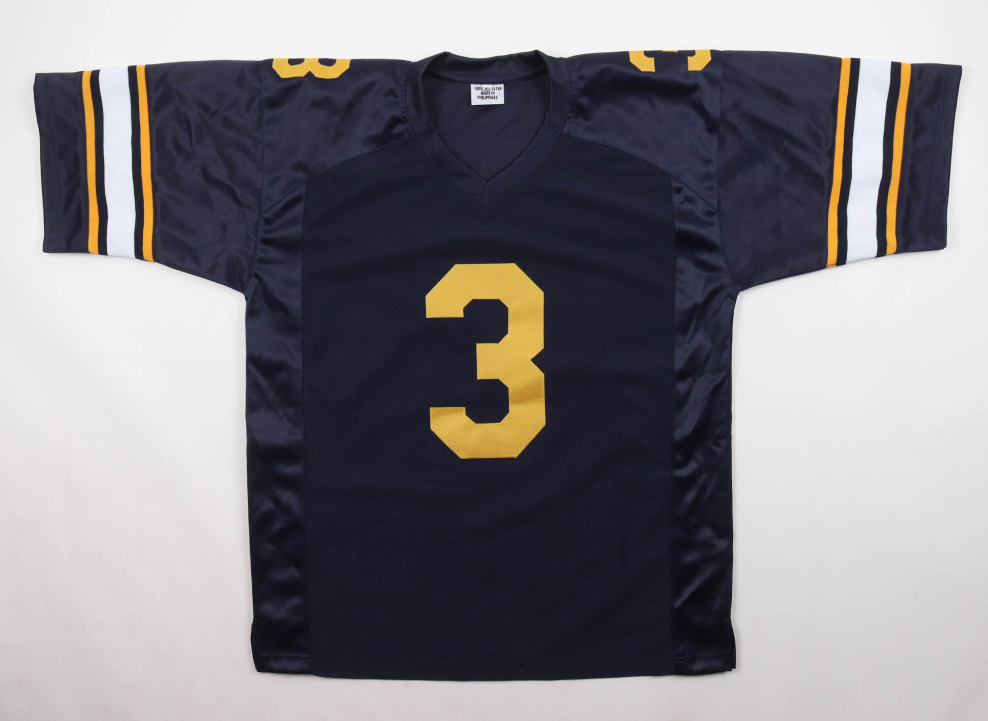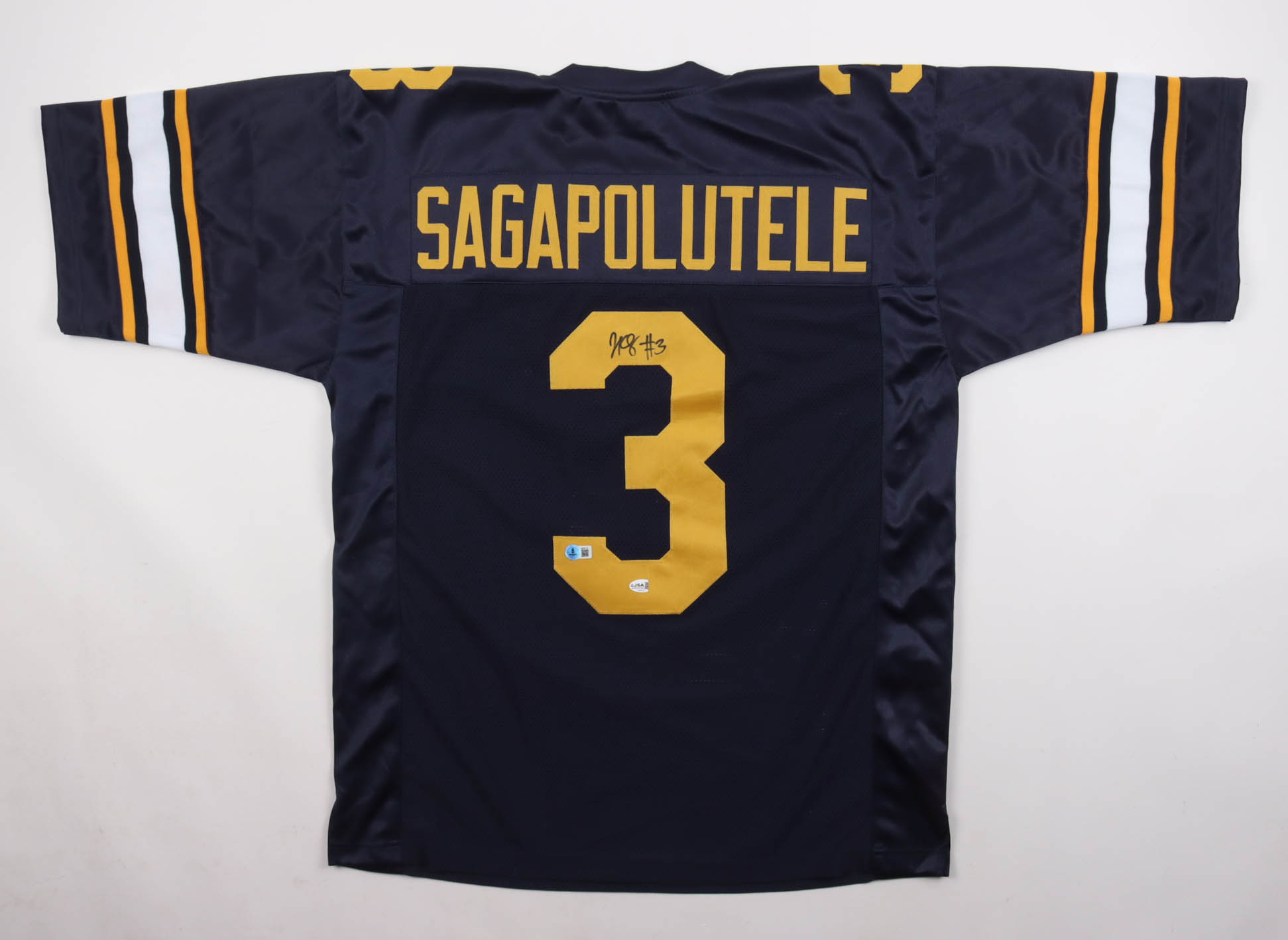 Custom jersey with everything sewn on, size XL. Hand-signed by Jaron-Keawe Sagapolutele. Please note, the JSA hologram is damaged.