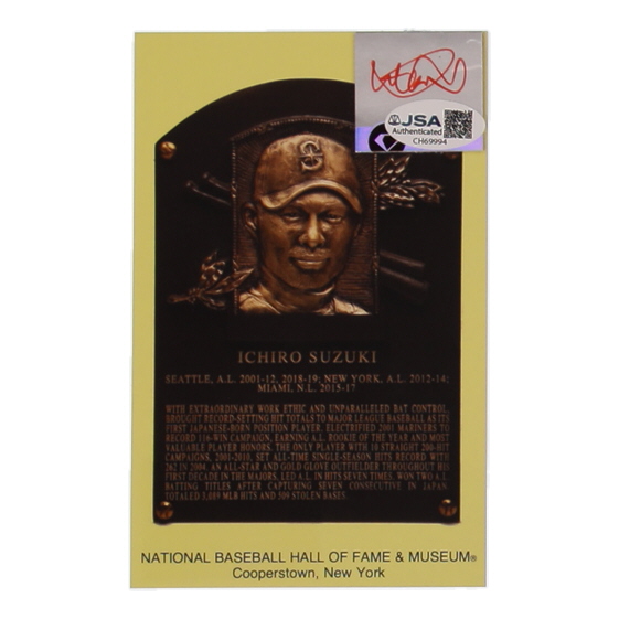 Hall Of Fame Plaque Postcard features a cut that has been hand-signed by Ichiro Suzuki (Seattle Mariners, HOF).