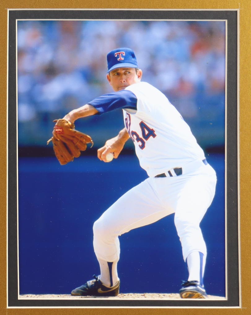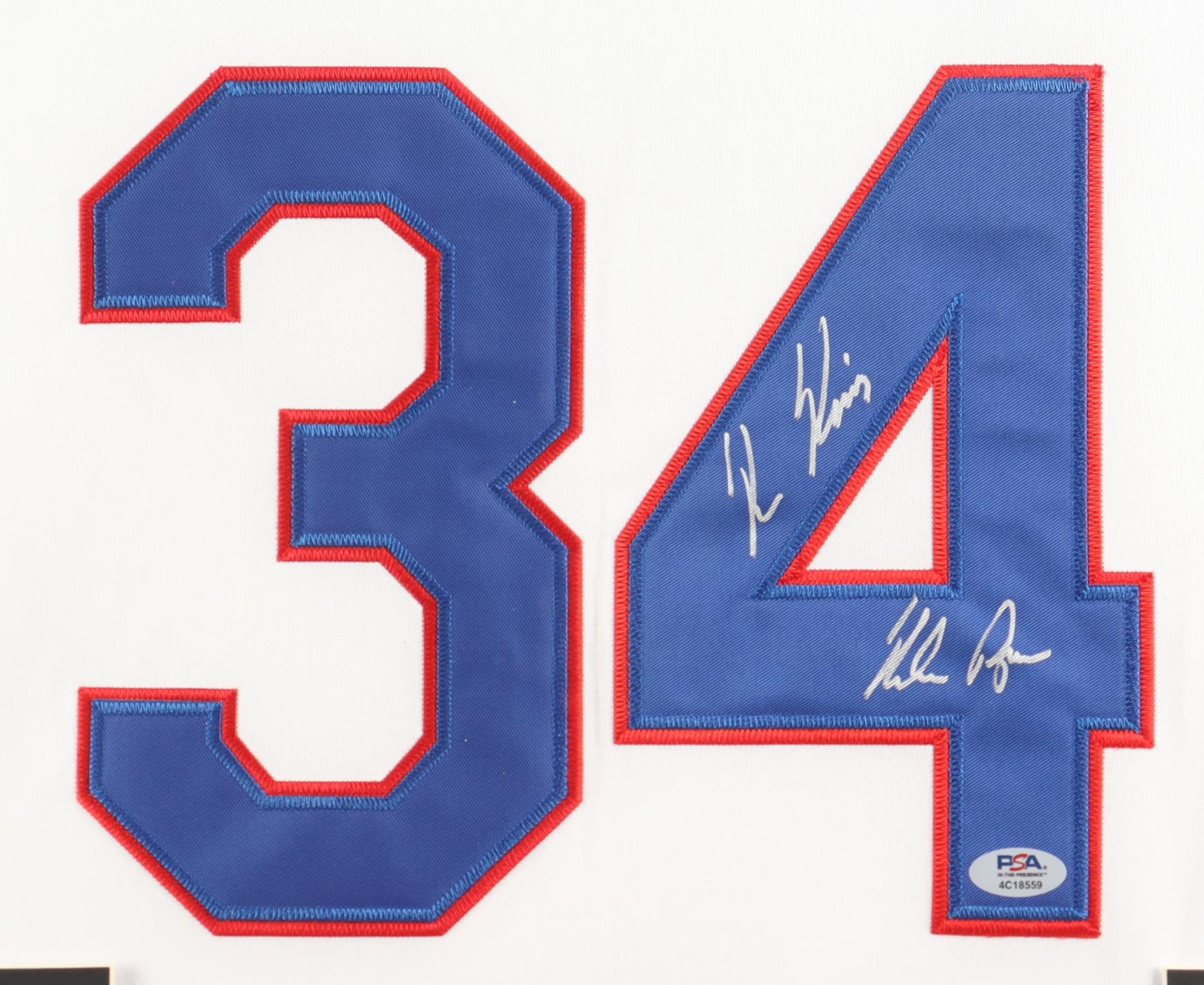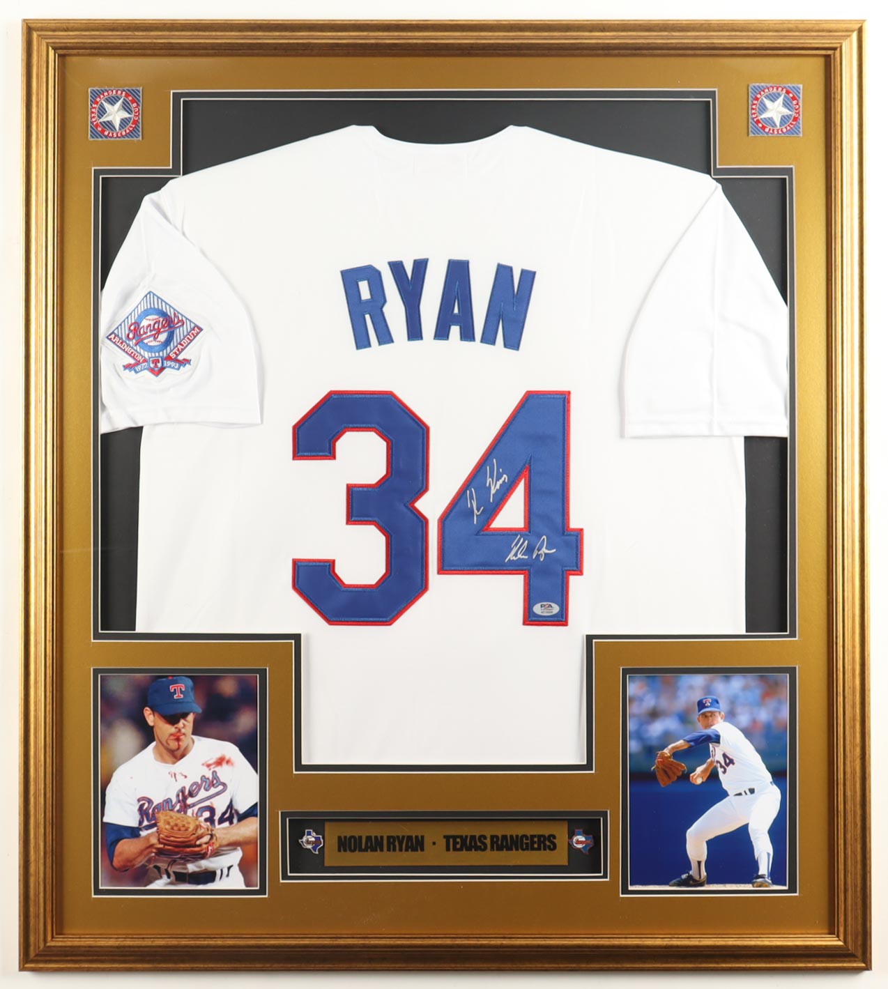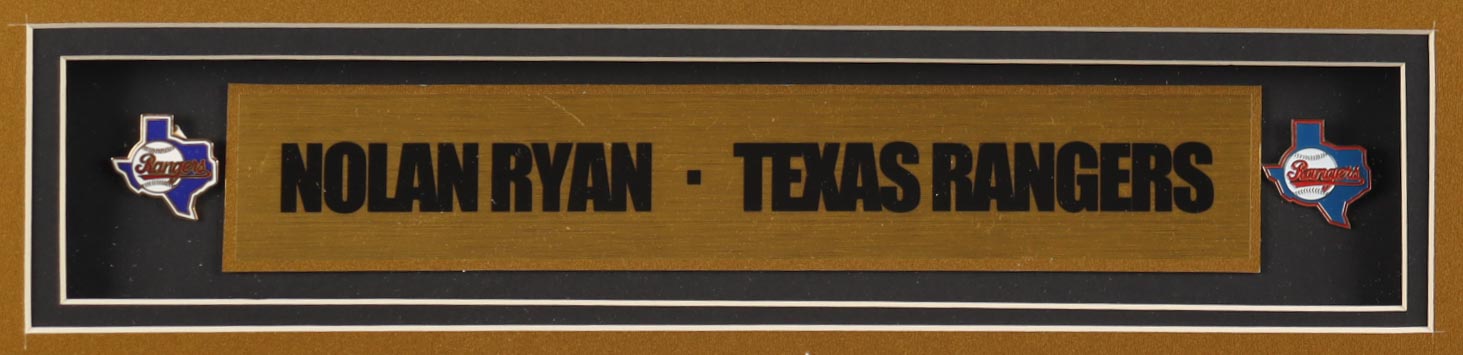 Custom frame display measures approximately 32" x 36" in size and features a jersey that has been hand-signed and inscribed by Nolan Ryan (Texas Rangers, HOF). The display also includes (2) Rangers logo pins, (2) photos, (2) cloth logo patches and a name plaque.