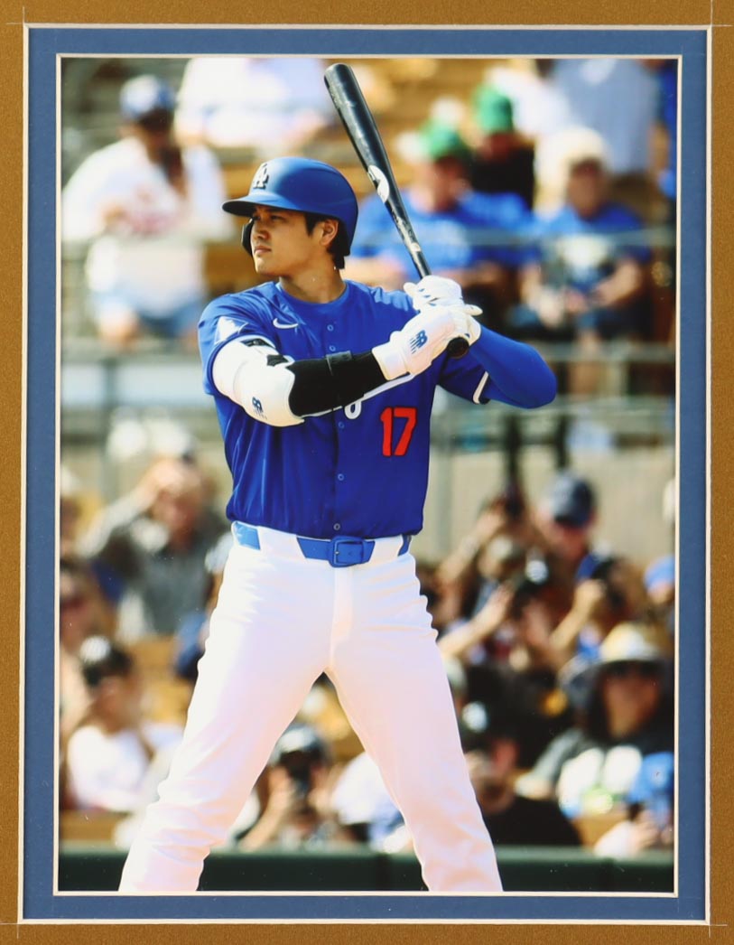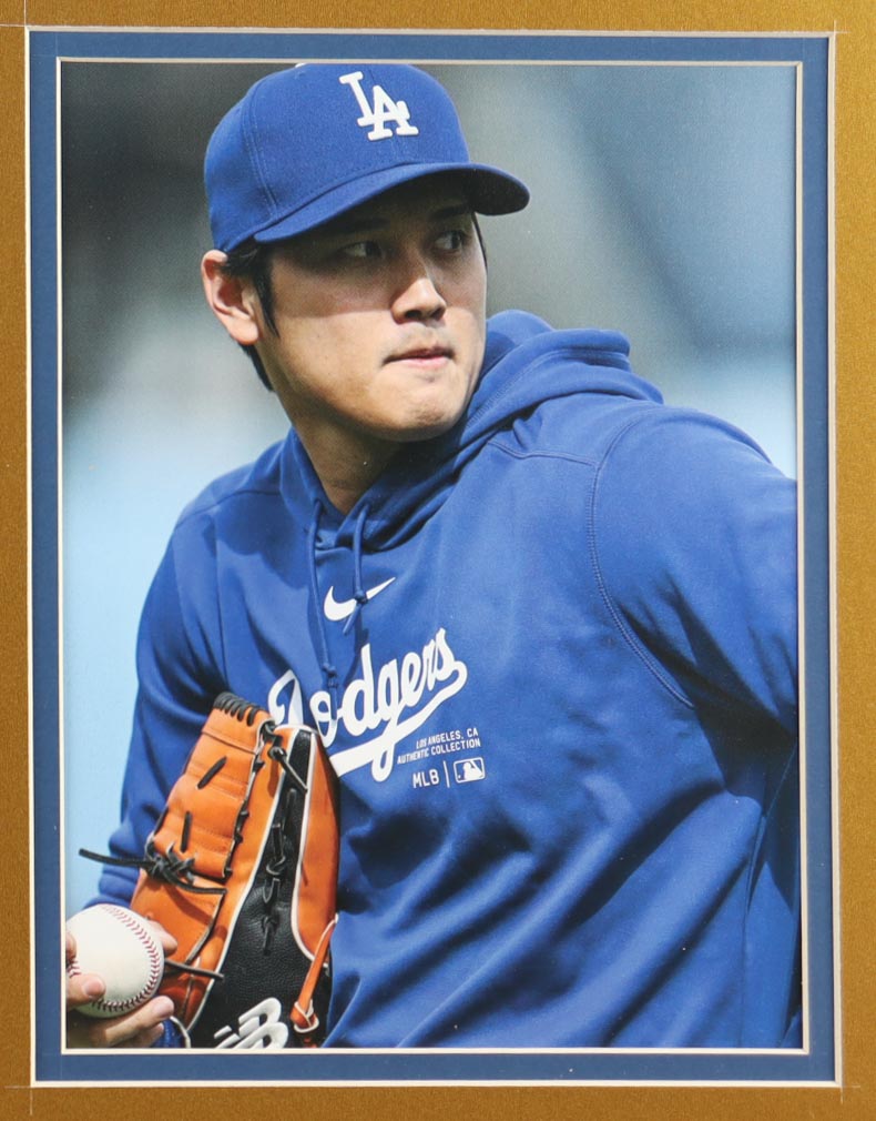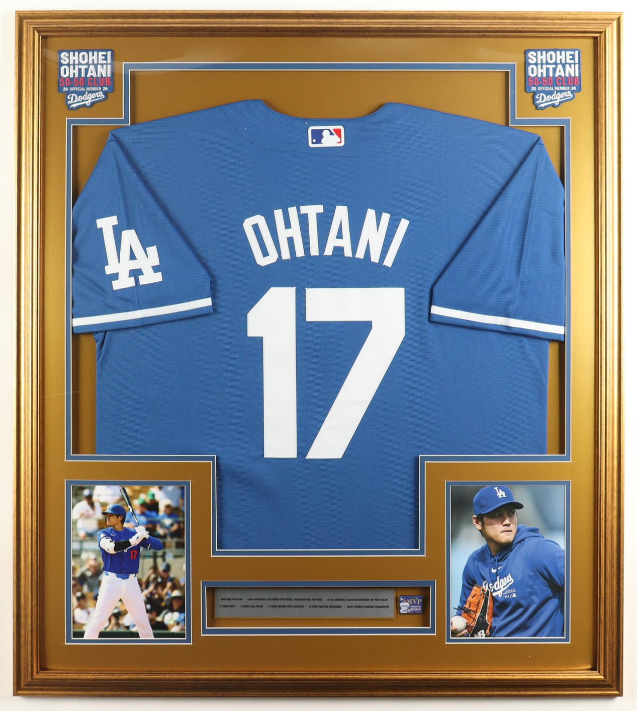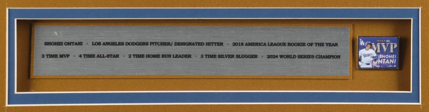 Custom frame measures approximately 33" x 37" in size and features an unsigned Shohei Ohtani jersey. The display also includes (2) Photos, career statistics plaque as well as an MVP pin. Please note, the display is unsigned.