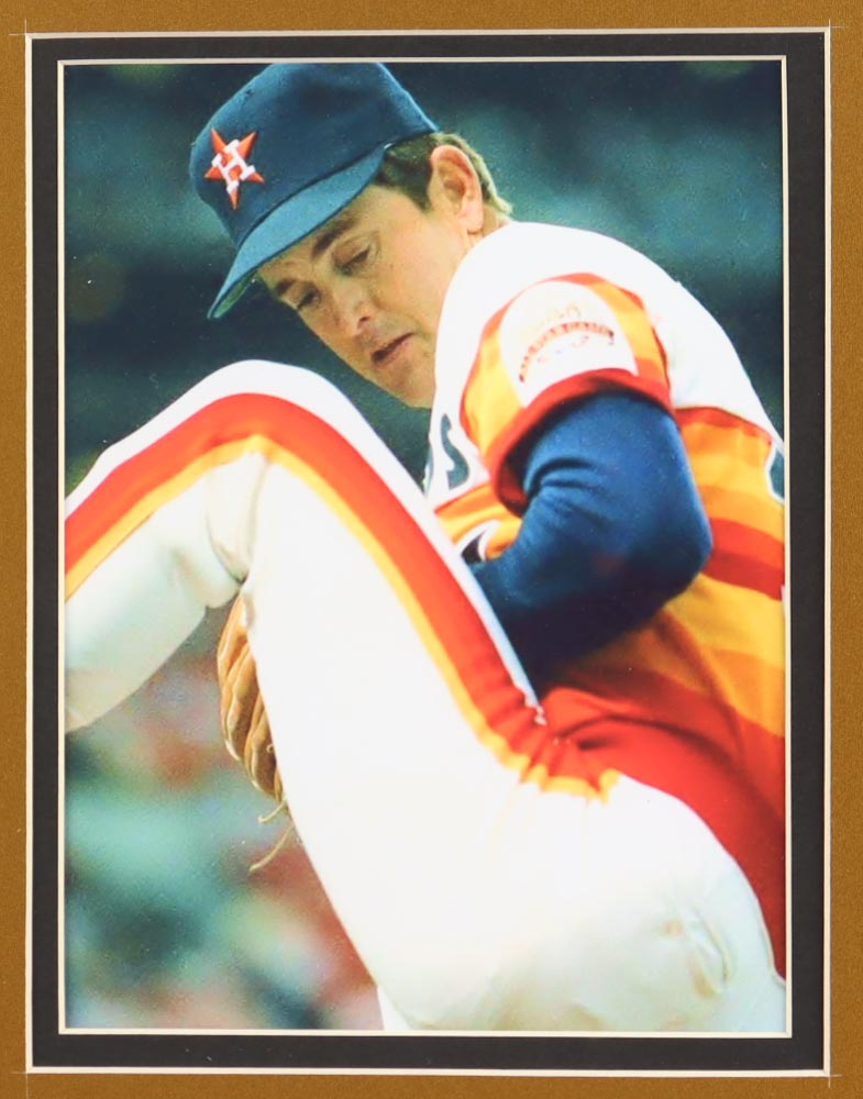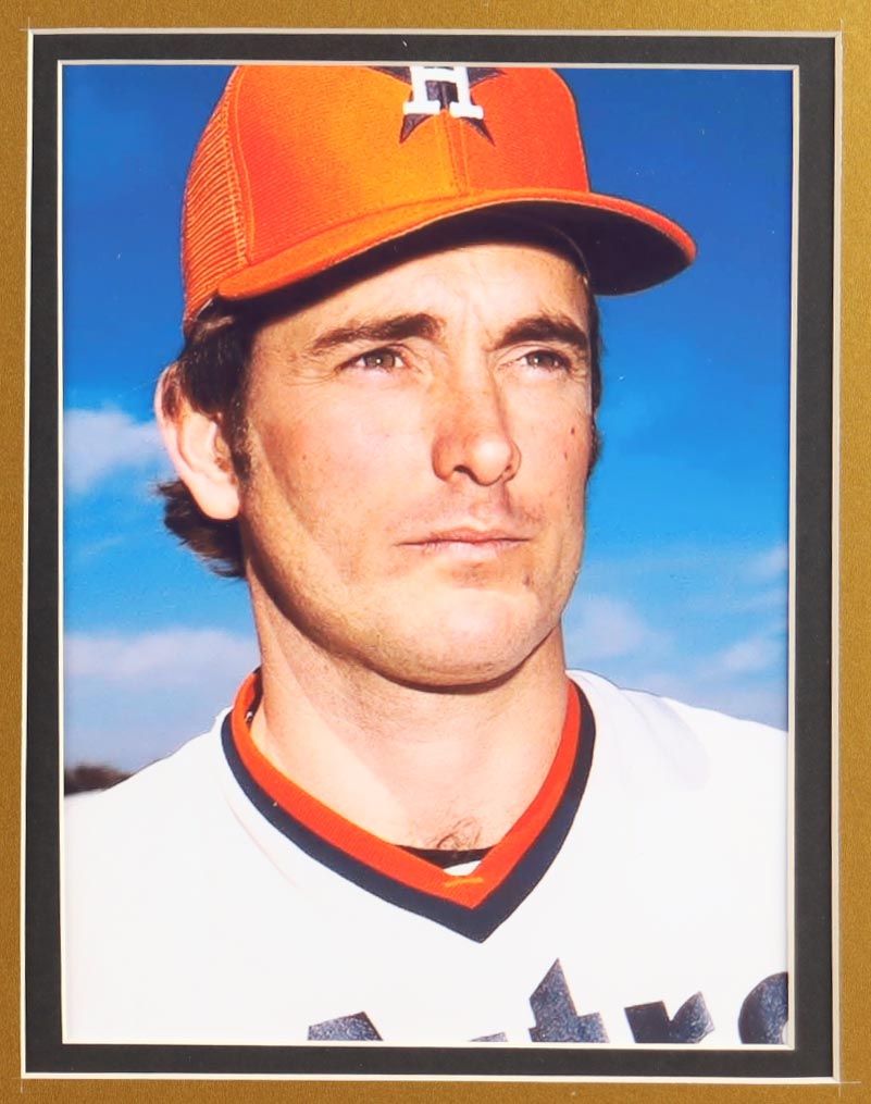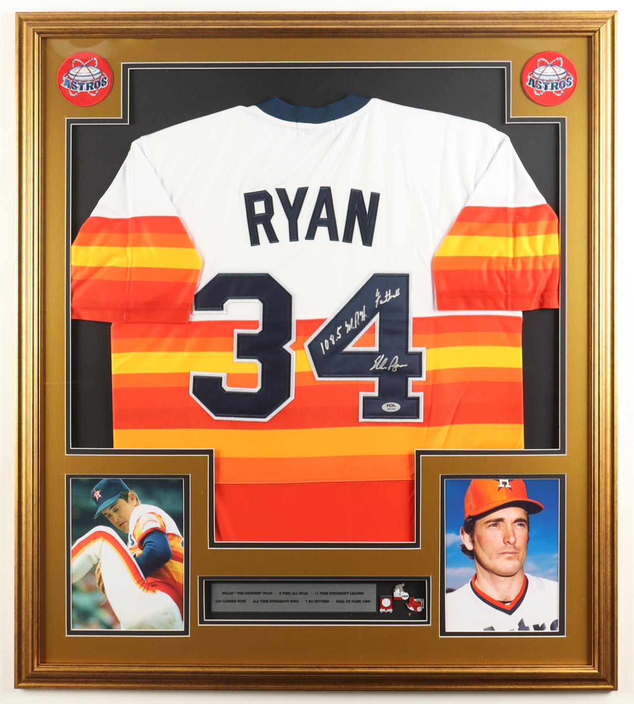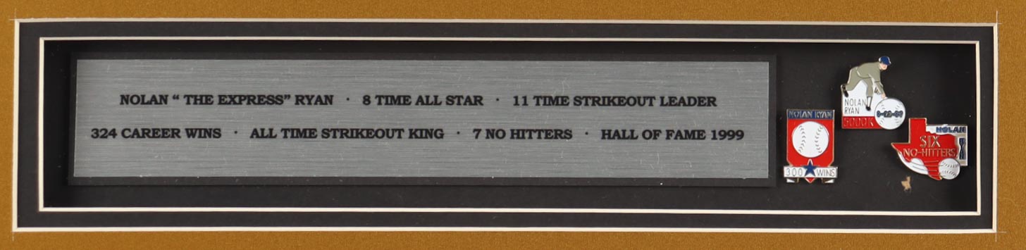 Custom frame display measures approximately 32" x 36" in size and features a jersey that has been hand-signed and inscribed by Nolan Ryan (Houston Astros, HOF). The display also includes (3) Nolan Ryan pins, (2) photos and (2) cloth team logo patches and a career statistics plaque.