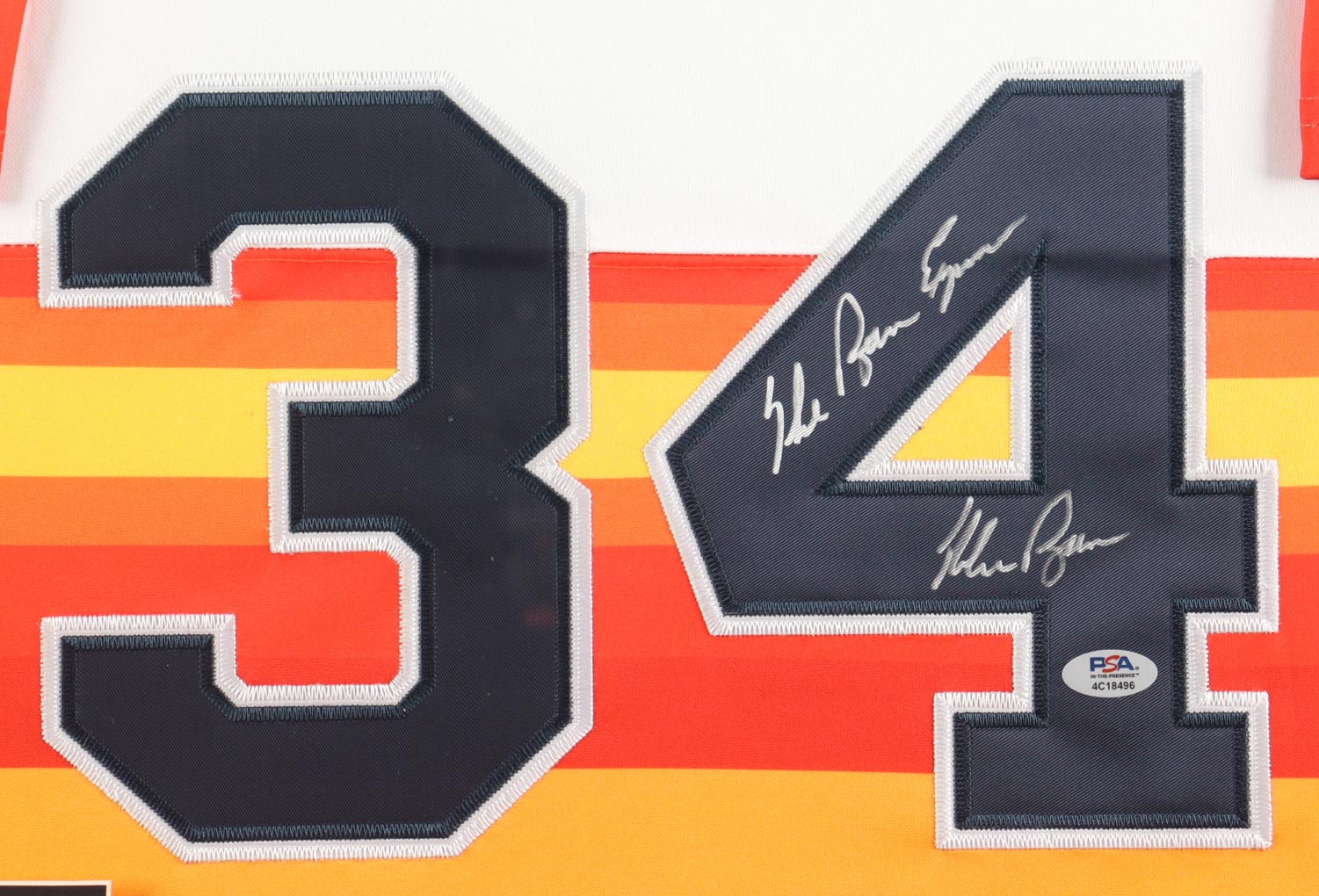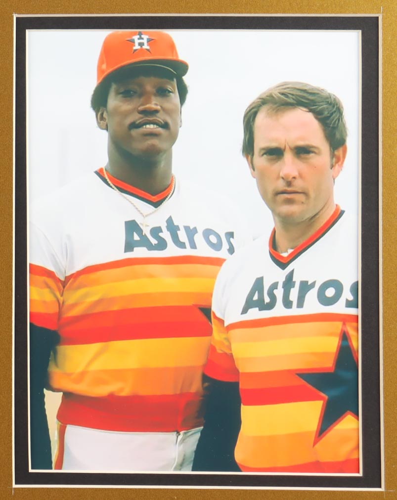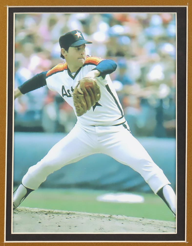 Custom frame display measures approximately 32" x 36" in size and features a jersey that has been hand-signed and inscribed by Nolan Ryan (Houston Astros, HOF). The display also includes (3) career statistics pins, (2) photos, (2) cloth logo patches and a name plaque.