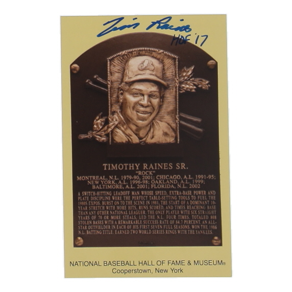 Hall of Fame Plaque Postcard has been hand-signed and inscribed by Tim Raines (Montreal Expos, HOF).