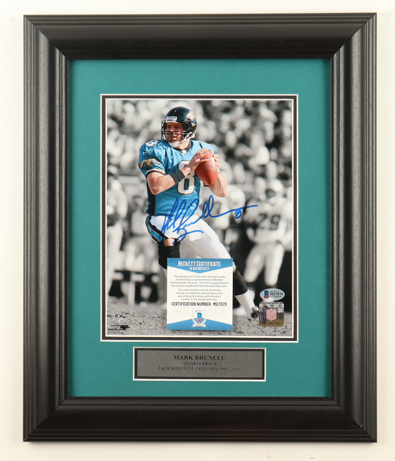 Custom frame measures 14" x 18" in size. Photograph is hand-signed by Mark Brunell (Jacksonville Jaguars). Display also features a nameplate.