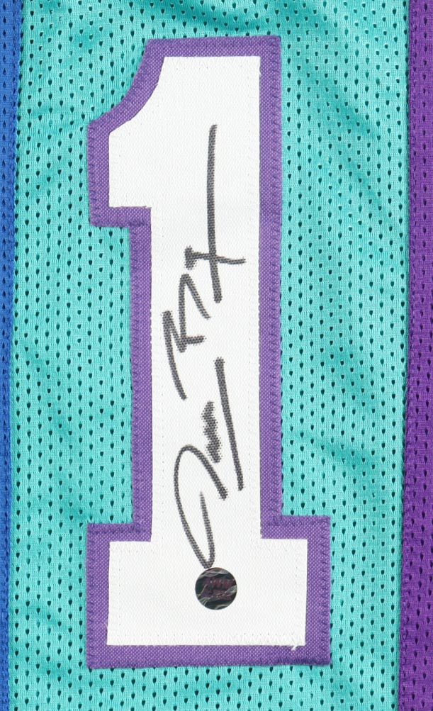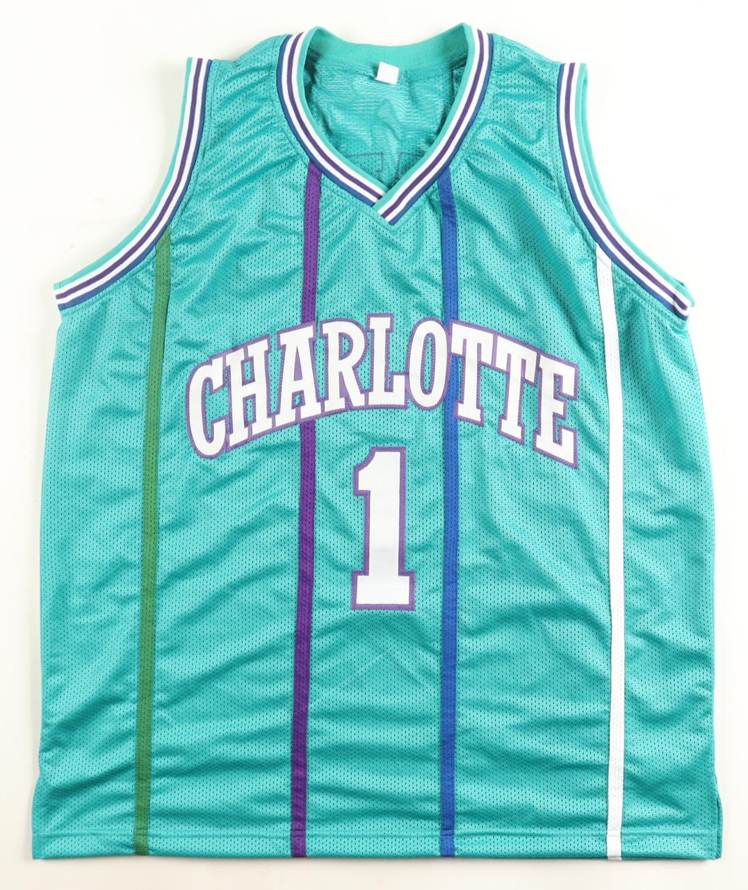Custom jersey with everything sewn on, size XL. Hand-signed by Muggsy Bogues. Please note, the signature ink has bled.