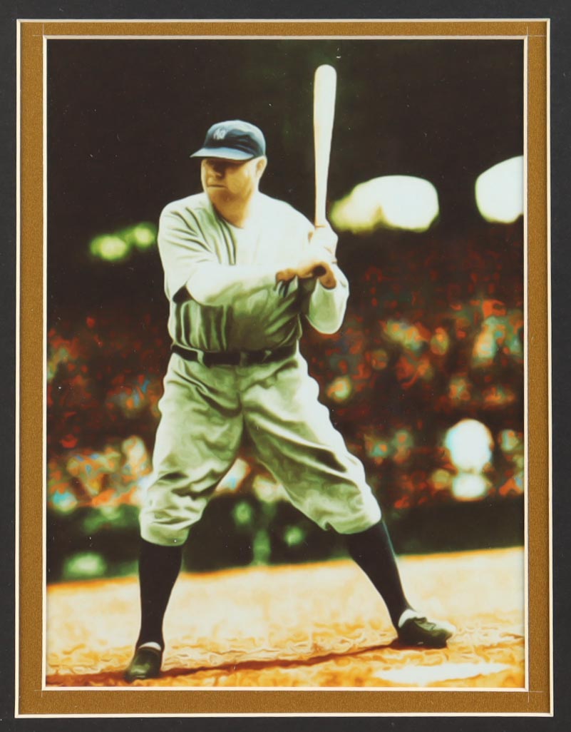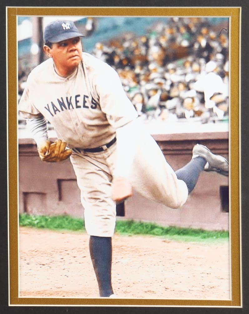 Custom frame measures approximately 33" x 37" in size and features an unsigned Babe Ruth jersey. The display also includes (2) Photos, career statistics plaque as well as (4) World Series pins. Please note, the display is unsigned.