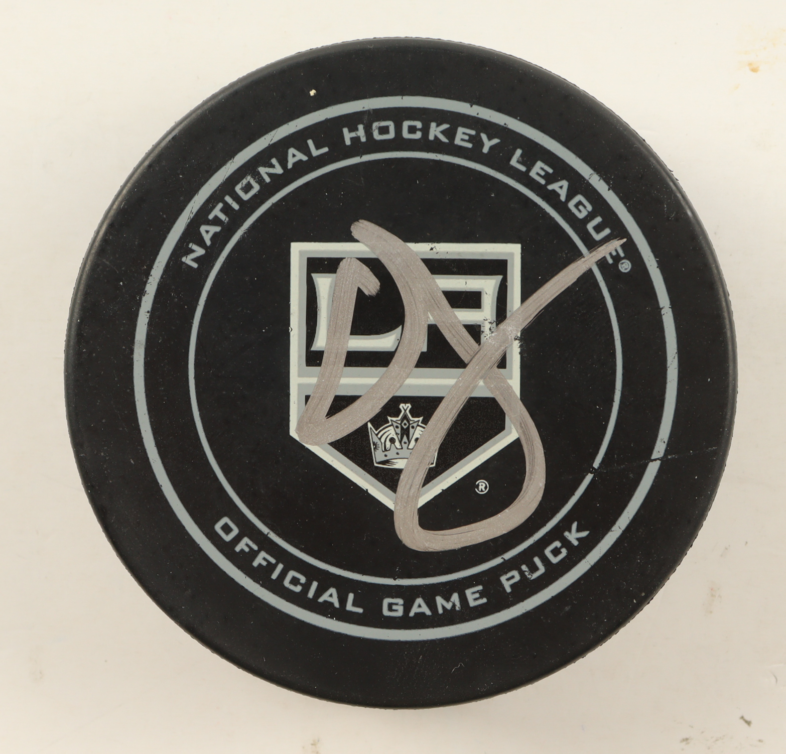 Los Angeles Kings logo hockey puck has been hand-signed by Drew Doughty.