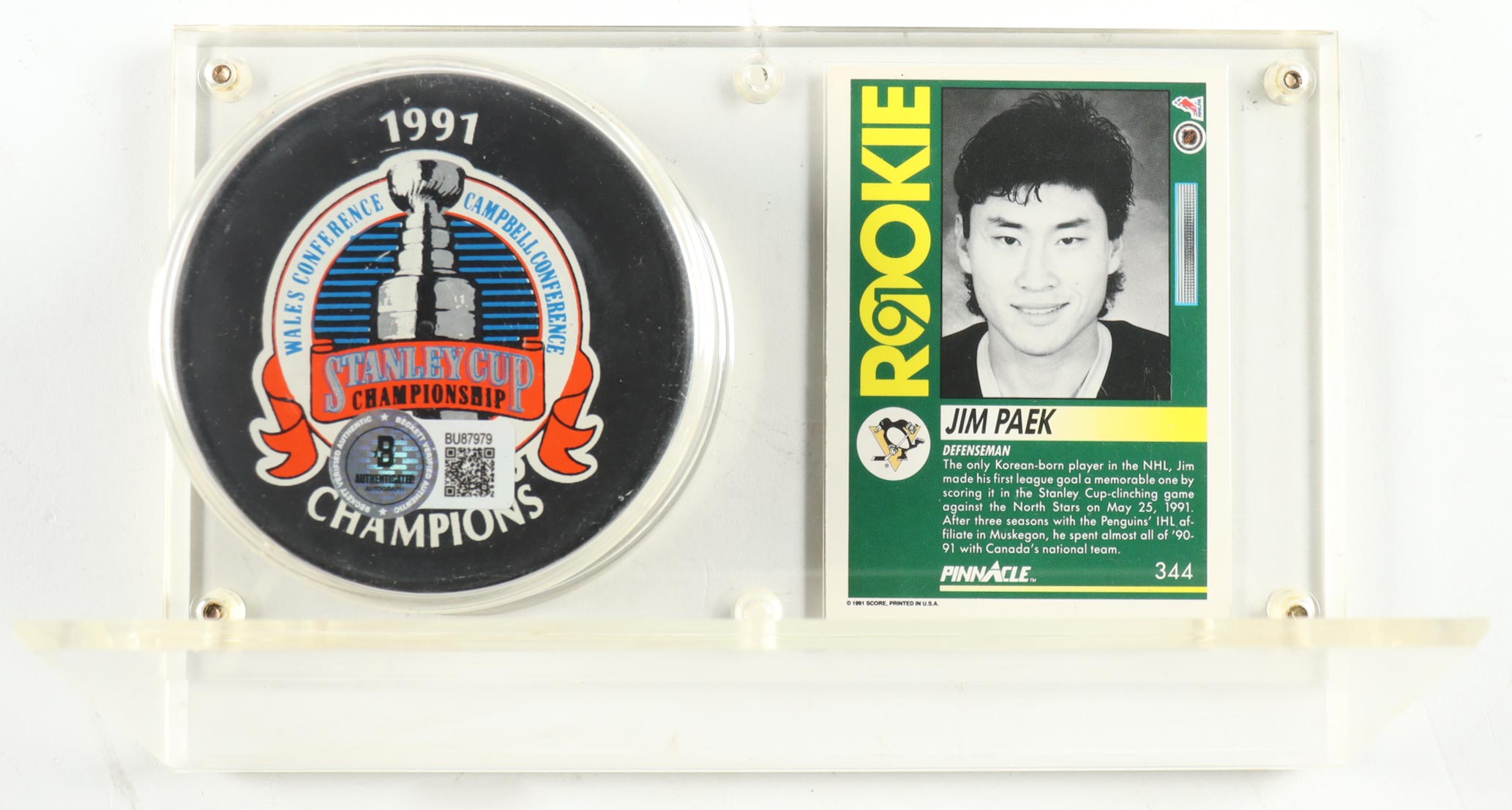 Jim Paek Signed Penguins Logo Hockey Puck Display With 1991-92 Pinnacle #344 RC (Beckett)