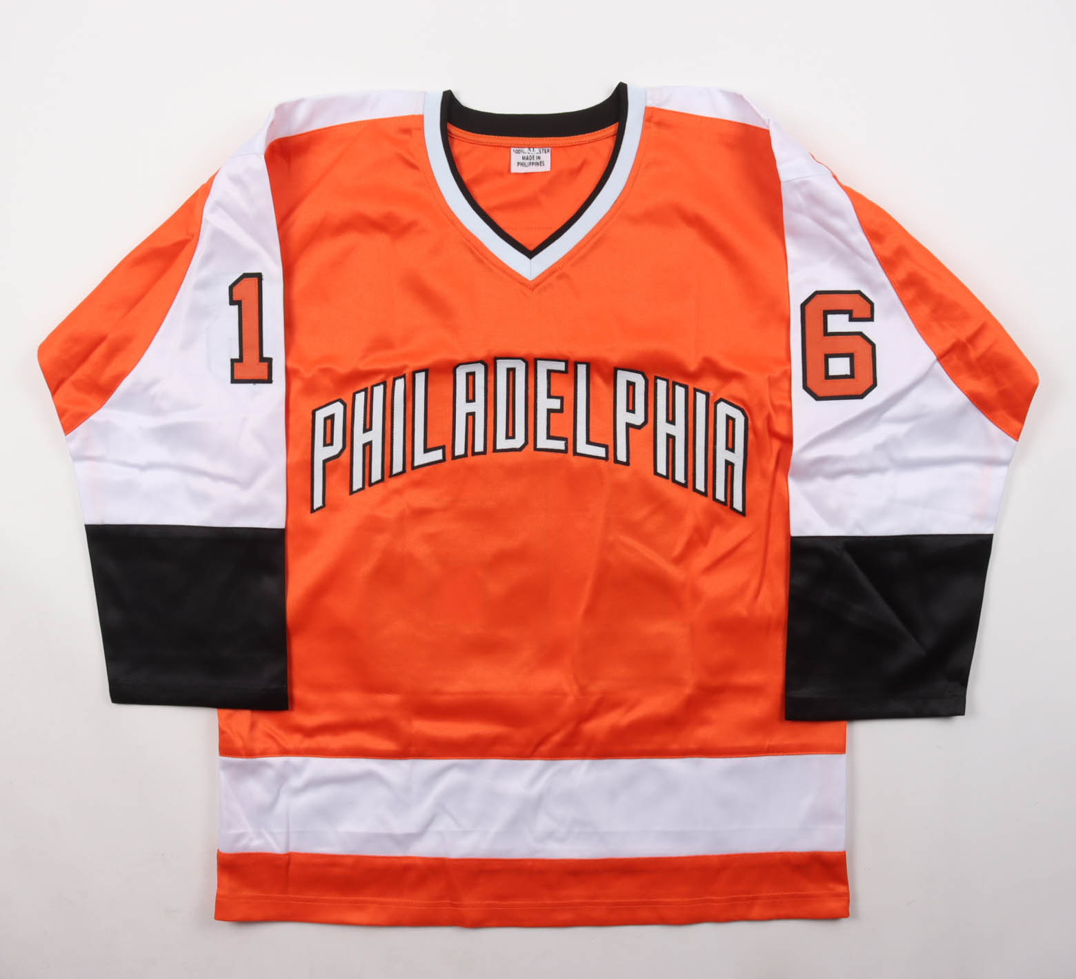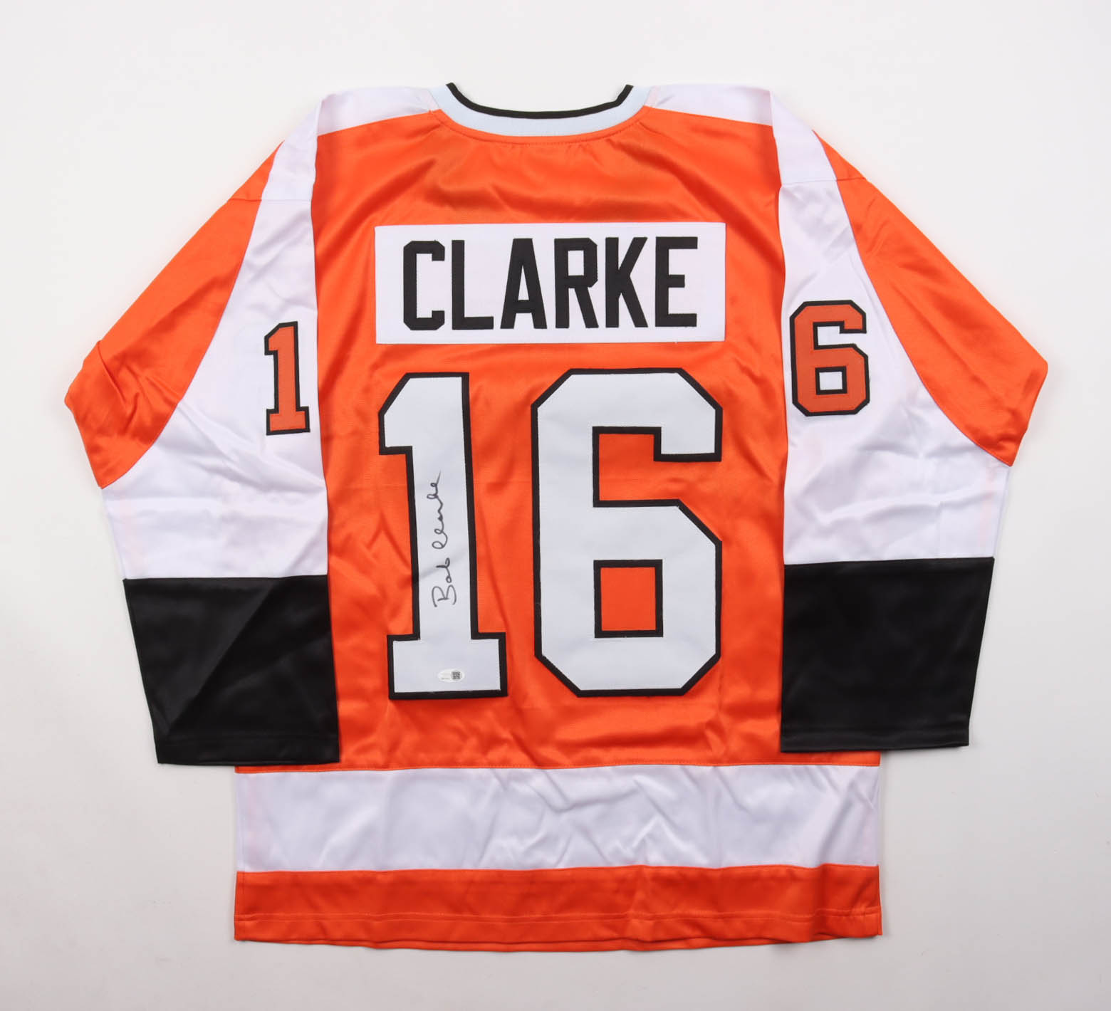 Custom jersey with everything sewn on, size XL. Hand-signed by Bobby Clarke (Philadelphia Flyers, HOF).