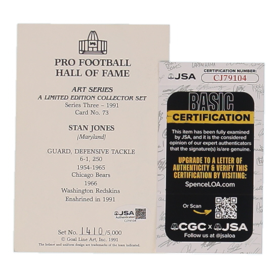 Card measures 4" x 6" in size and has been hand-signed by Stan Jones (Chicago Bears, HOF). Limited edition #1410/5000.