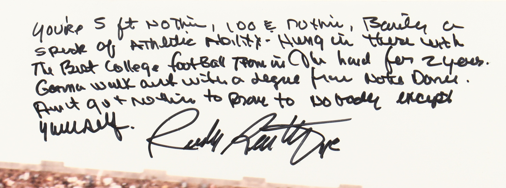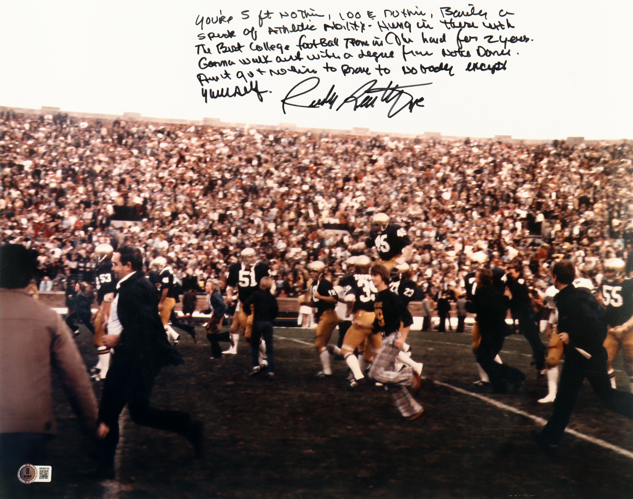Photo measures 16” x 20” in size and has been hand-signed and inscribed by Rudy Ruettiger.