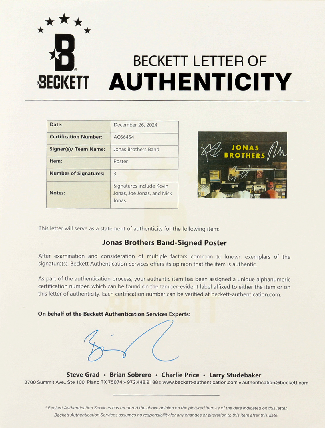Jonas Brothers 11x17 Poster Signed by Joe, Kevin & Nick Jonas (Beckett)
