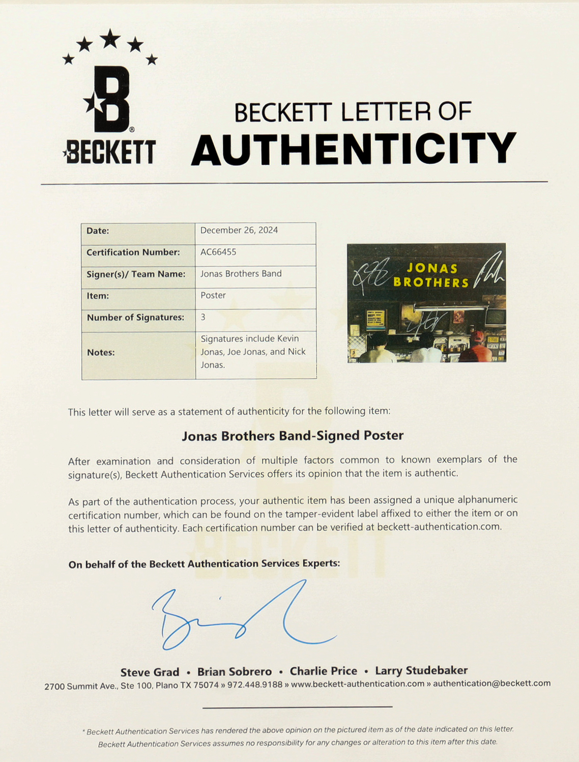 Jonas Brothers 11x17 Poster Signed by Joe, Kevin & Nick Jonas (Beckett)