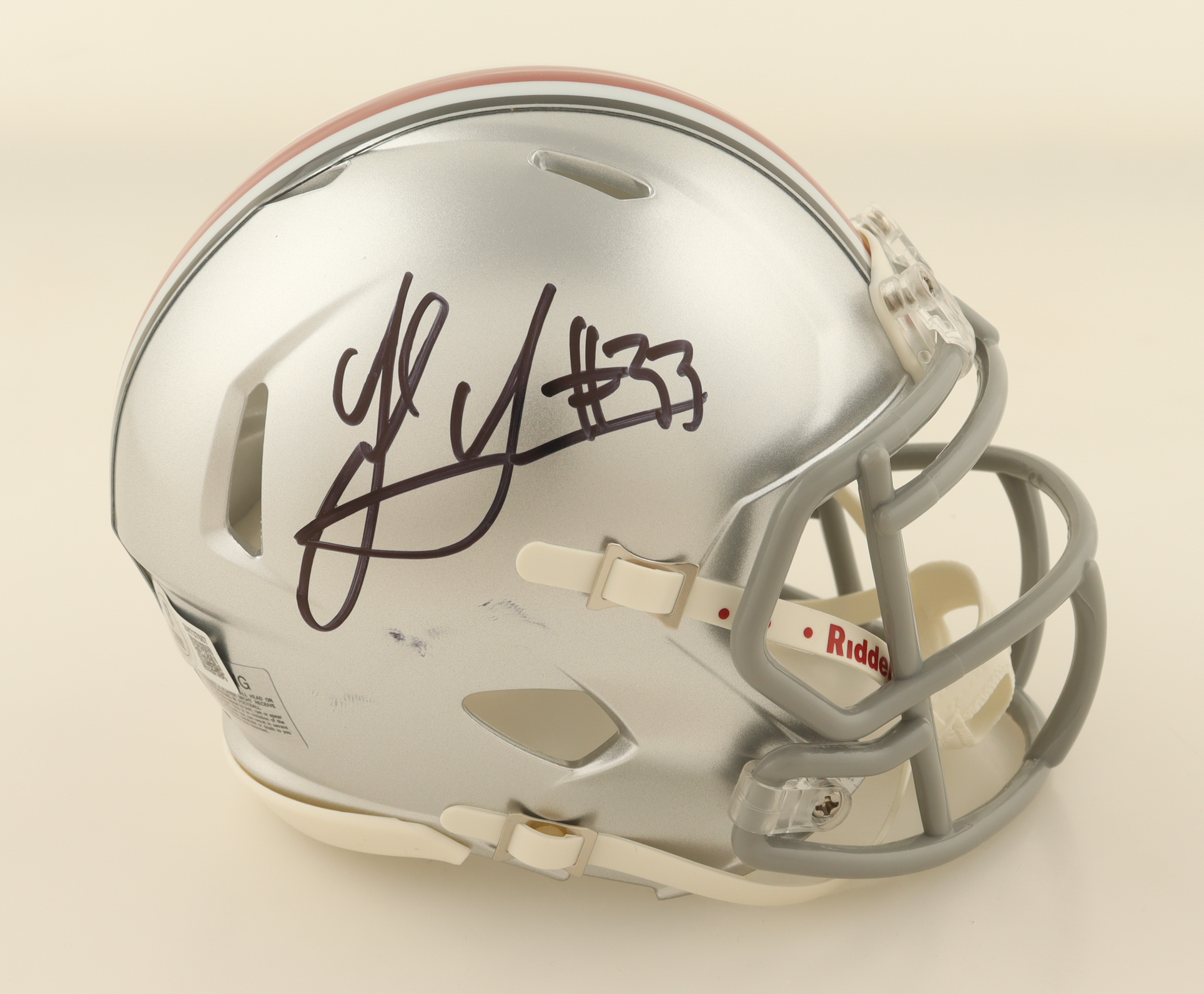 Riddell Ohio State Buckeyes Speed mini helmet. Hand-signed by Jack Sawyer. Please note, the helmet has some stray pen marks.
