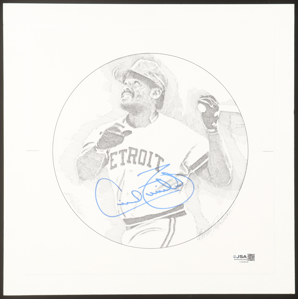 Art print measures approximately 11" x 11" in size and features an art print that has been hand-signed by Cecil Fielder (Detroit Tigers) as well as the artist, Murray Tinkelman. Please note, there is some scuffing and corner wear on the matting.