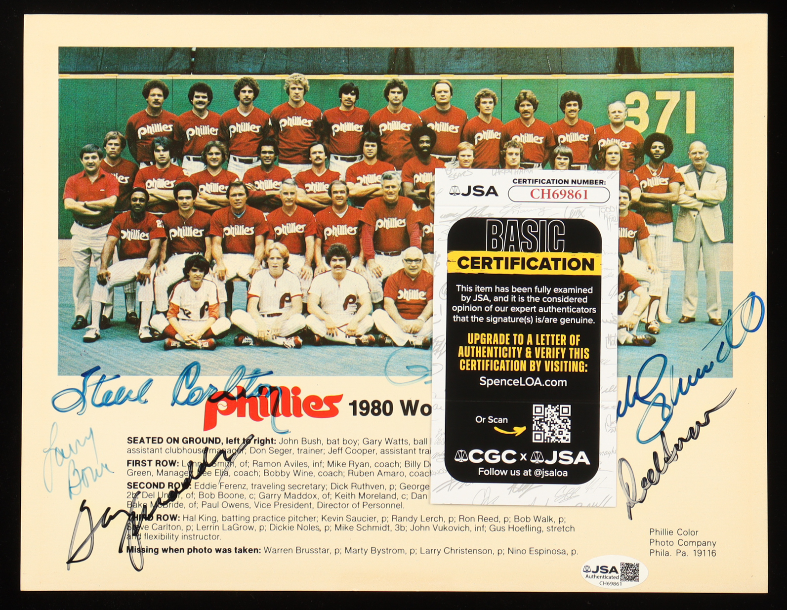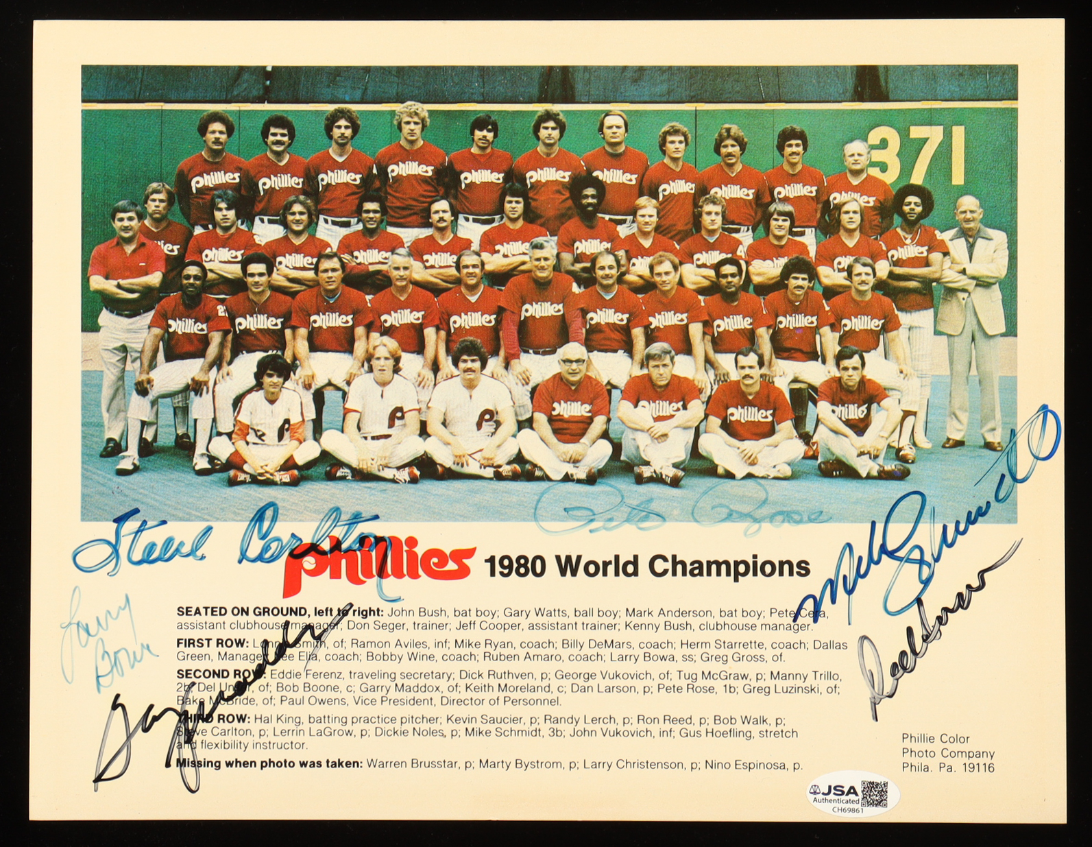 Photo measures 8" x 10" in size. Hand-signed by Pete Rose, Steve Carlton, Mike Schmidt, Larry Bowa, Del Unser, & (1) unknown other. Refer to photo for more details on the condition of the item.
