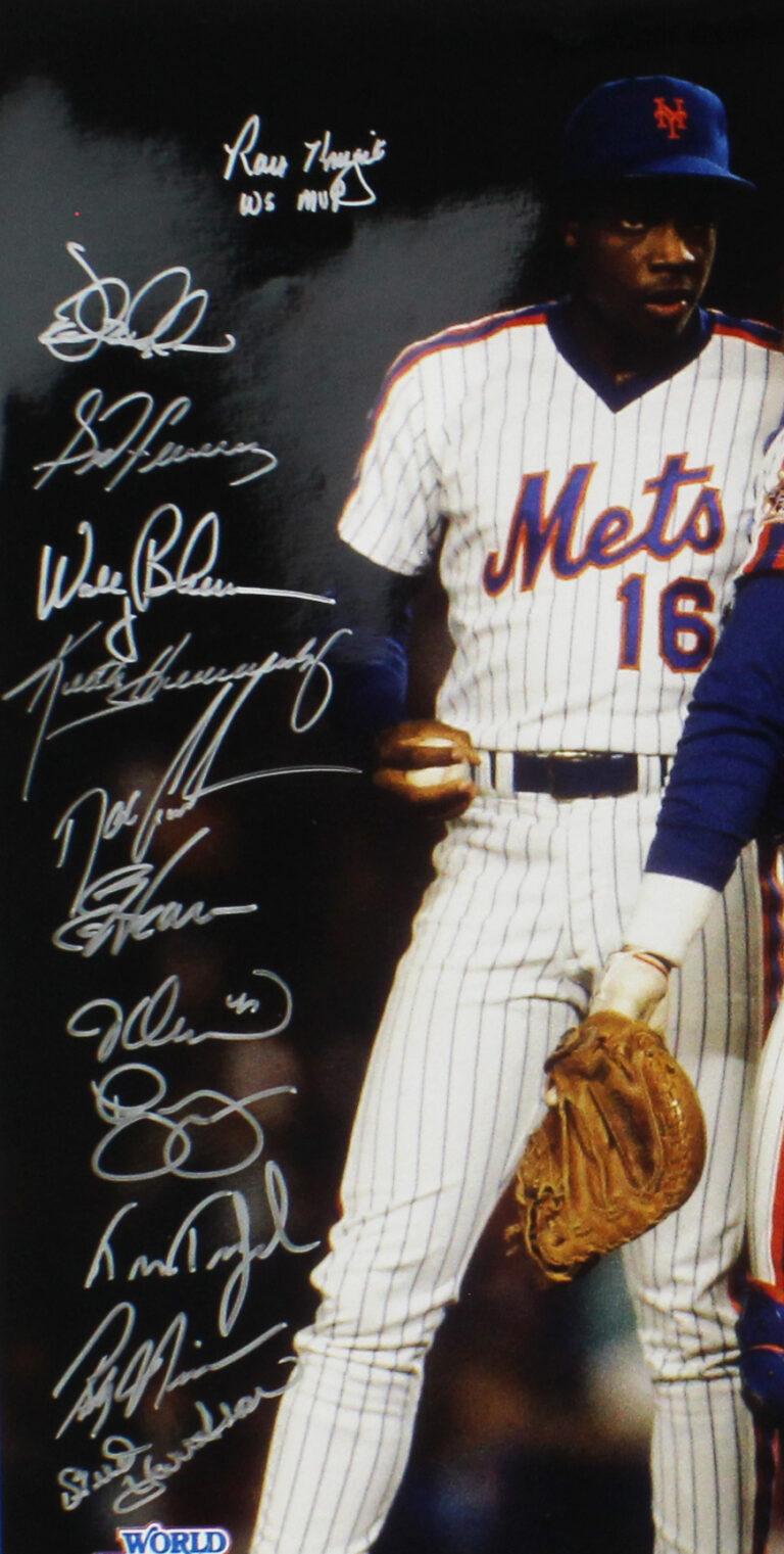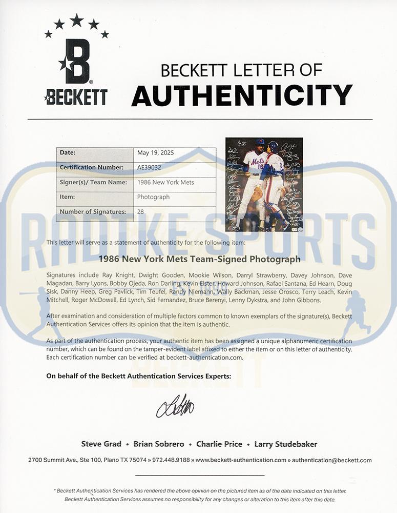 Photo measures 16” x 20” in size and has been hand-signed by (28) 1986 New York Mets Alumni including: Ray Knight, Dwight Gooden, Mookie Wilson, Darryl Strawberry, Davey Johnson, Dave Magadan, Barry Lyons, Bobby Ojeda, Ron Darling, Kevin Elster, Howard Johnson, Rafael Santana, Ed Hearn, Doug Sisk, Danny Heep, Greg Pavlick, Tim Teufel, Randy Niemann, Wally Backman, Jesse Orosco, Terry Leach, Kevin Mitchell, Roger McDowell, Ed Lynch, Sid Fernandez, Bruce Berenyi, Lenny Dykstra, and John Gibbons.