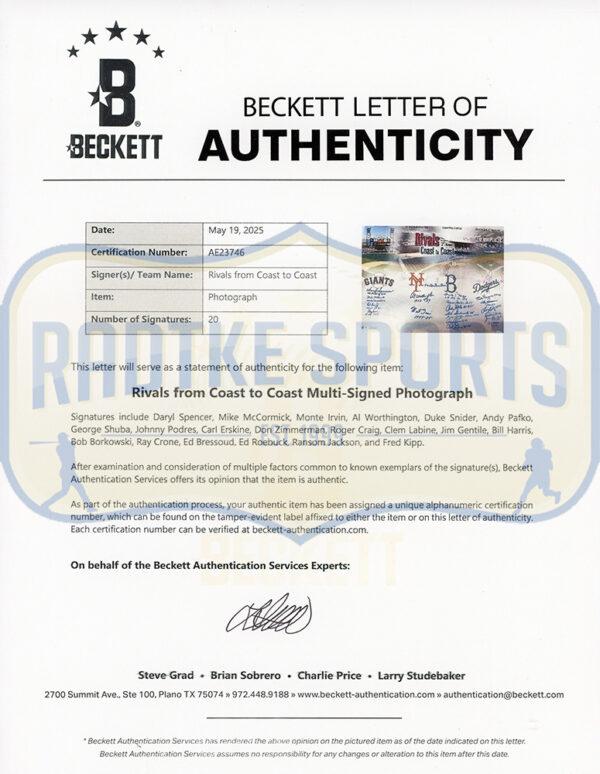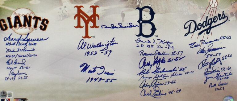 Photo measures 16” x 20” in size and has been hand-signed by (20) baseball alumni from the San Francisco Giants, New York Mets, Boston Red Sox, and Los Angeles Dodgers! Signers include Daryl Spencer, Mike McCormick, Monte Irvin, Al Worthington, Duke Snider, Andy Pafko, George Shuba, Johnny Podres, Carl Erskine, Don Zimmerman, Roger Craig, Clem Labine, Jim Gentile, Bill Harris, Bob Borkowski, Ray Crone, Ed Bressoud, Ed Roebuck, Ransom Jackson, and Fred Kipp.