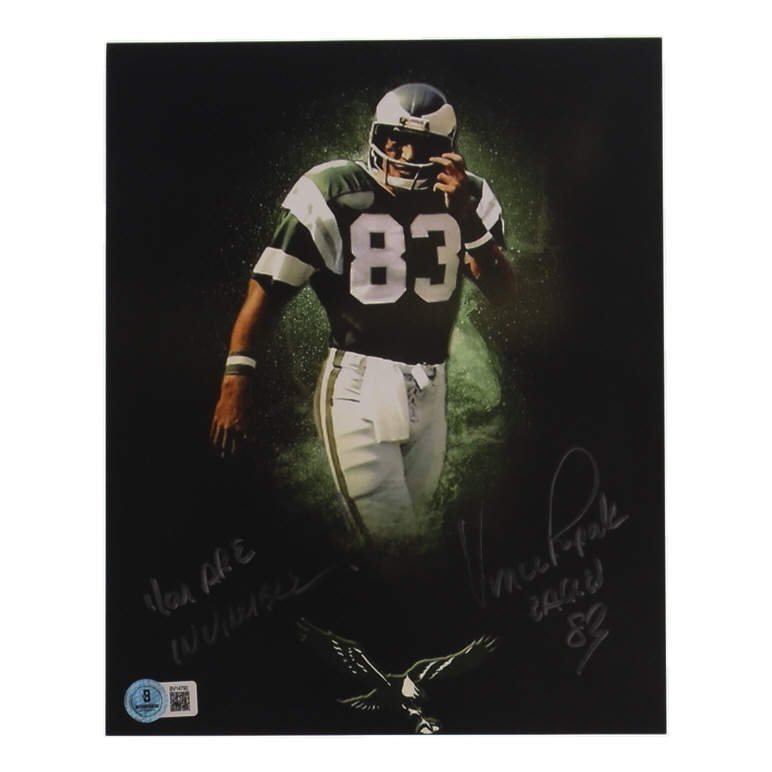 Photo measures 8" x 10" in size and has been hand-signed and inscribed by Vince Papale (Philadelphia Eagles).