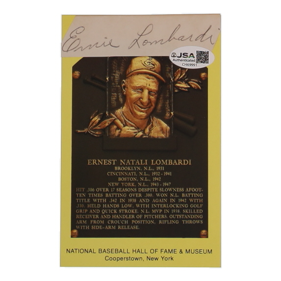 Ernie Lombardi Signed Cut on Hall Of Fame Plaque Postcard (JSA)