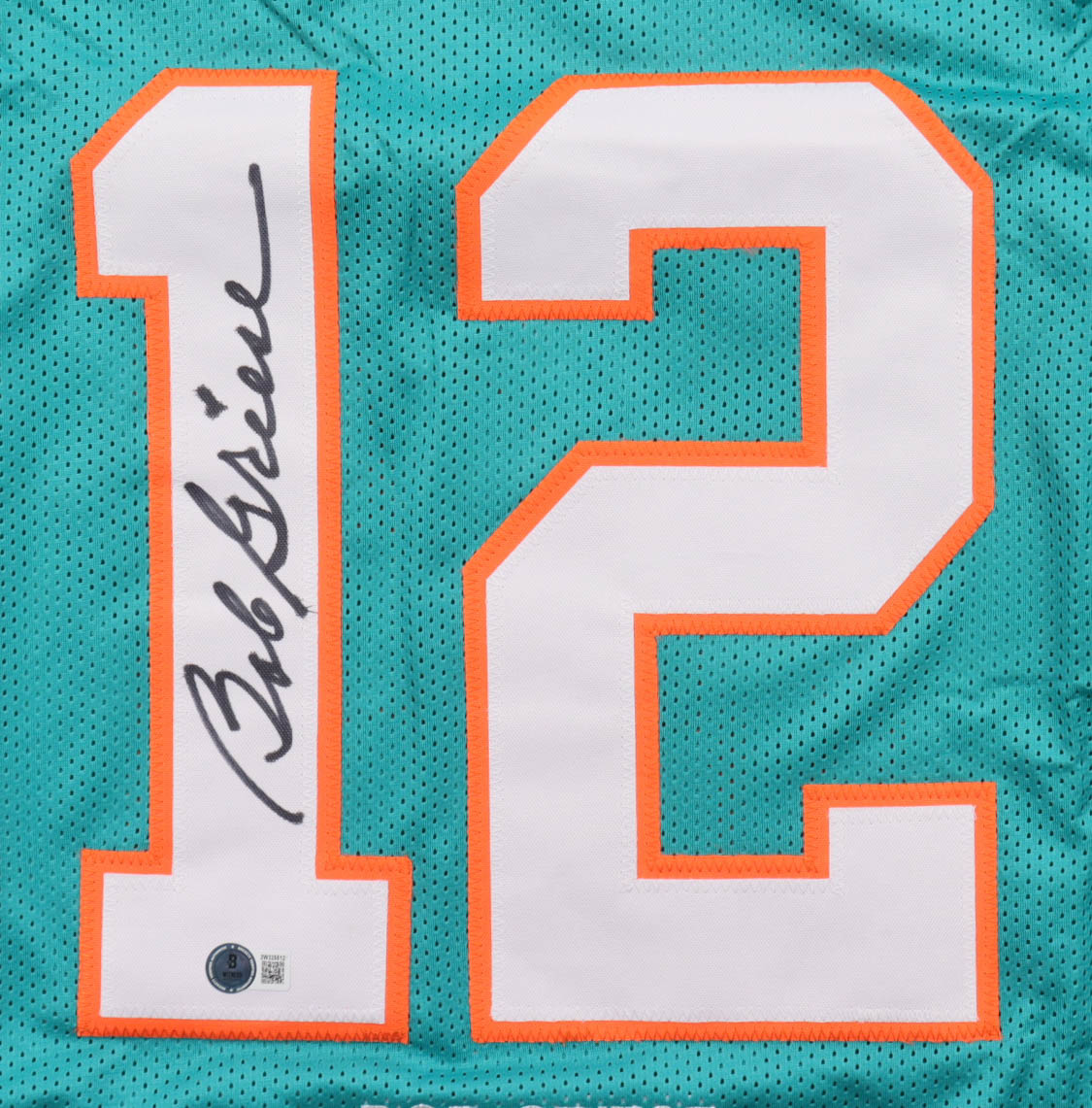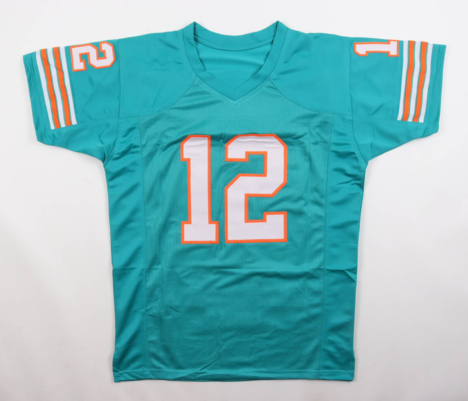 Custom jersey. Everything is sewn on, size XL. Hand-signed by Bob Griese (HOF). Griese's career highlights have been custom stitched onto the back of the jersey below the reverse numbers.