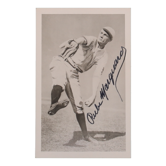 Postcard measures approximately 3.5" x 5.5" in size and has been hand-signed by Rube Marquard (D. 1980, New York Giants, HOF).