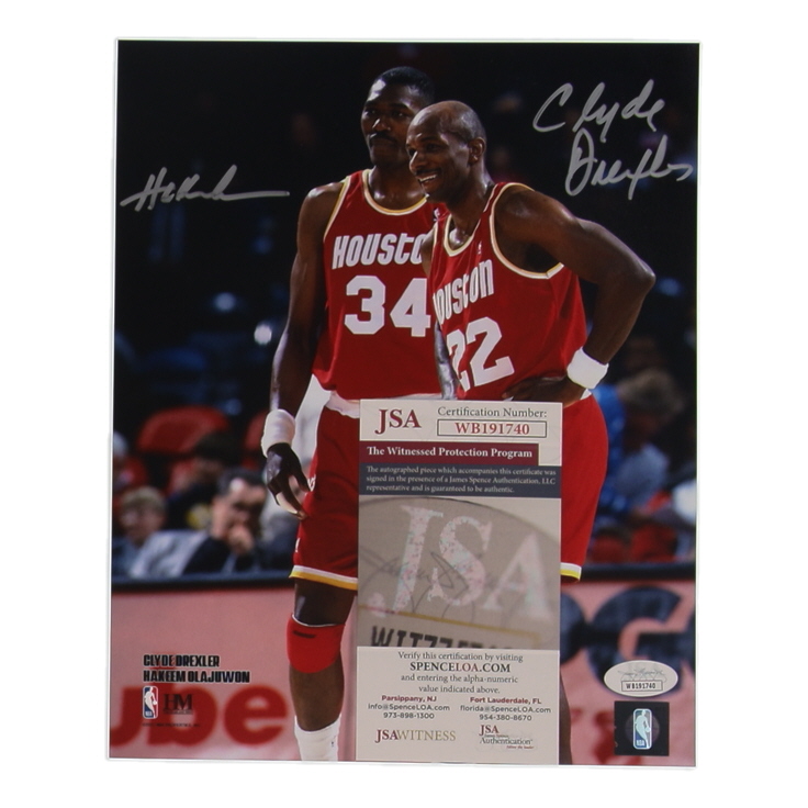 Clyde Drexler & Hakeem Olajuwon Signed Rockets 8x10 Photo (JSA)