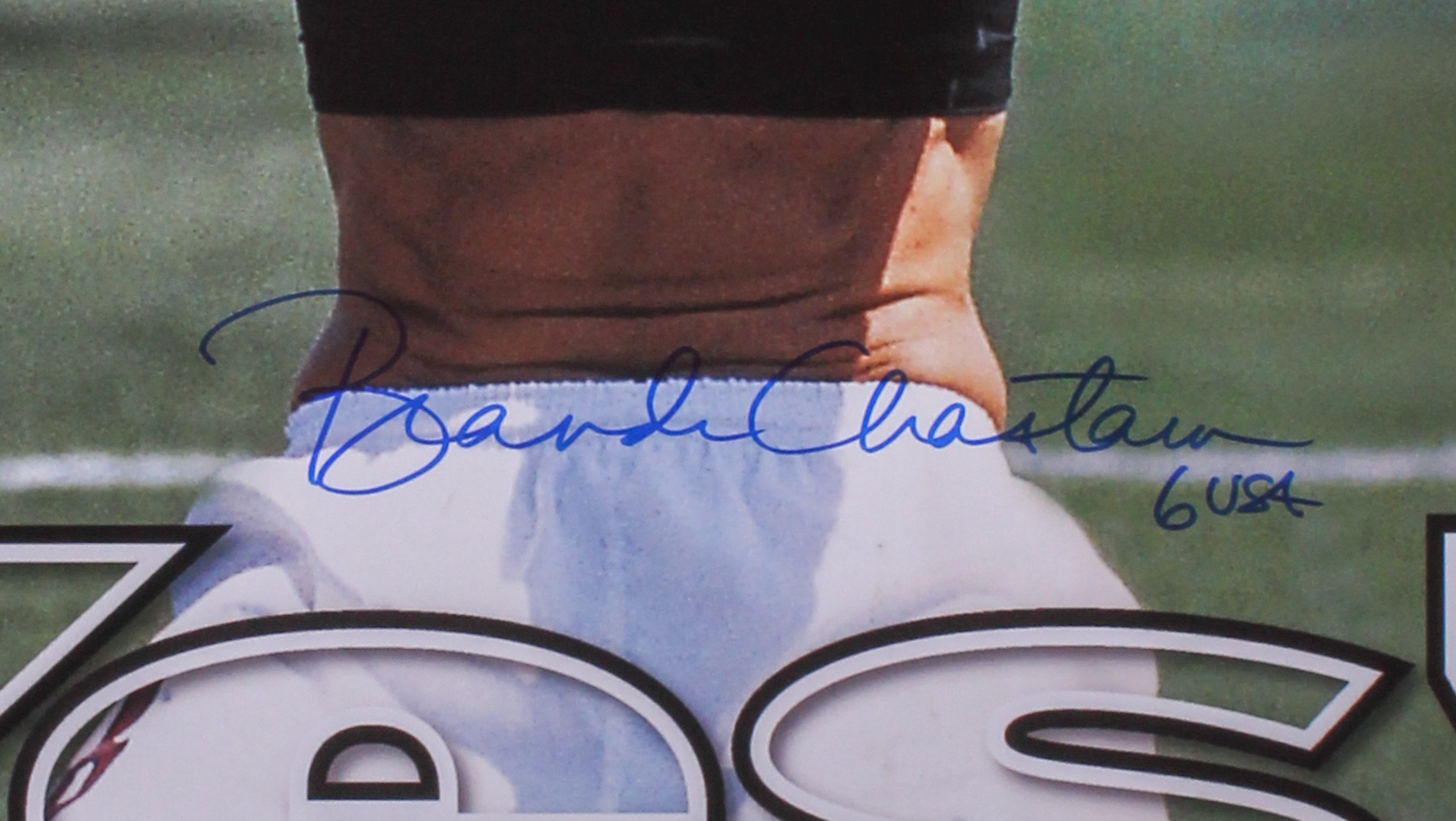 Photo measures 16" x 20" in size and has been hand signed and inscribed by Brandi Chastain (HOF).