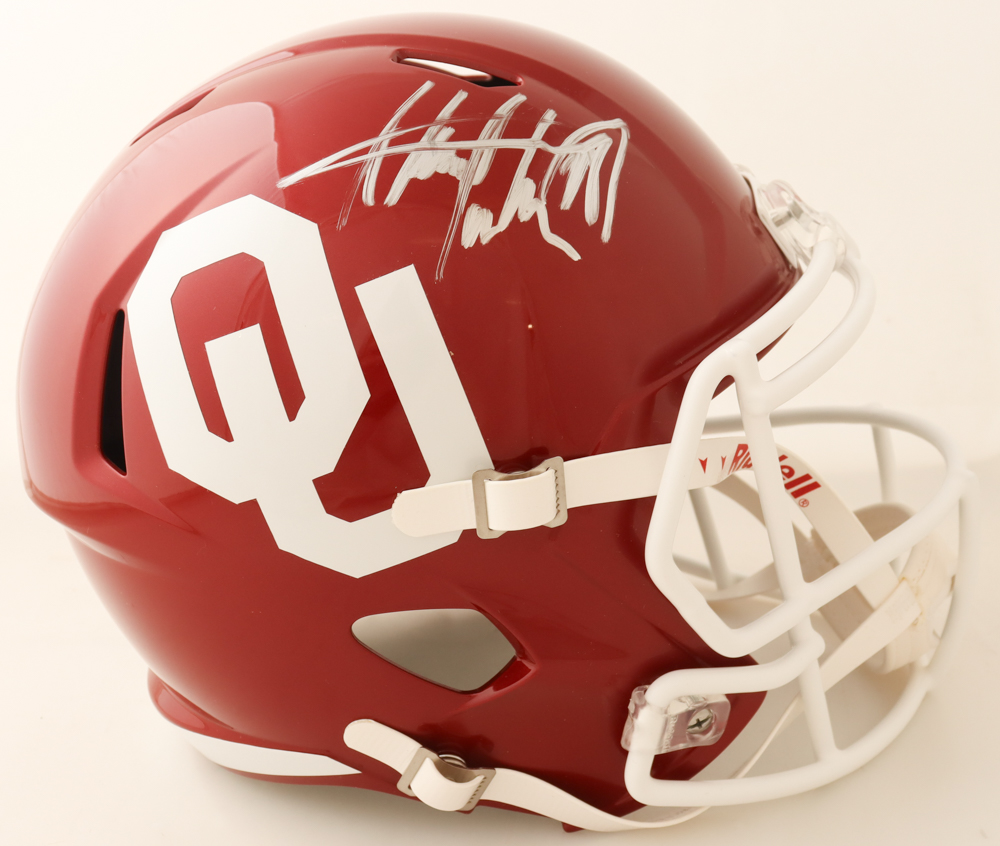 Riddell Oklahoma Sooners full-size replica helmet. Hand-signed by Adrian Peterson.