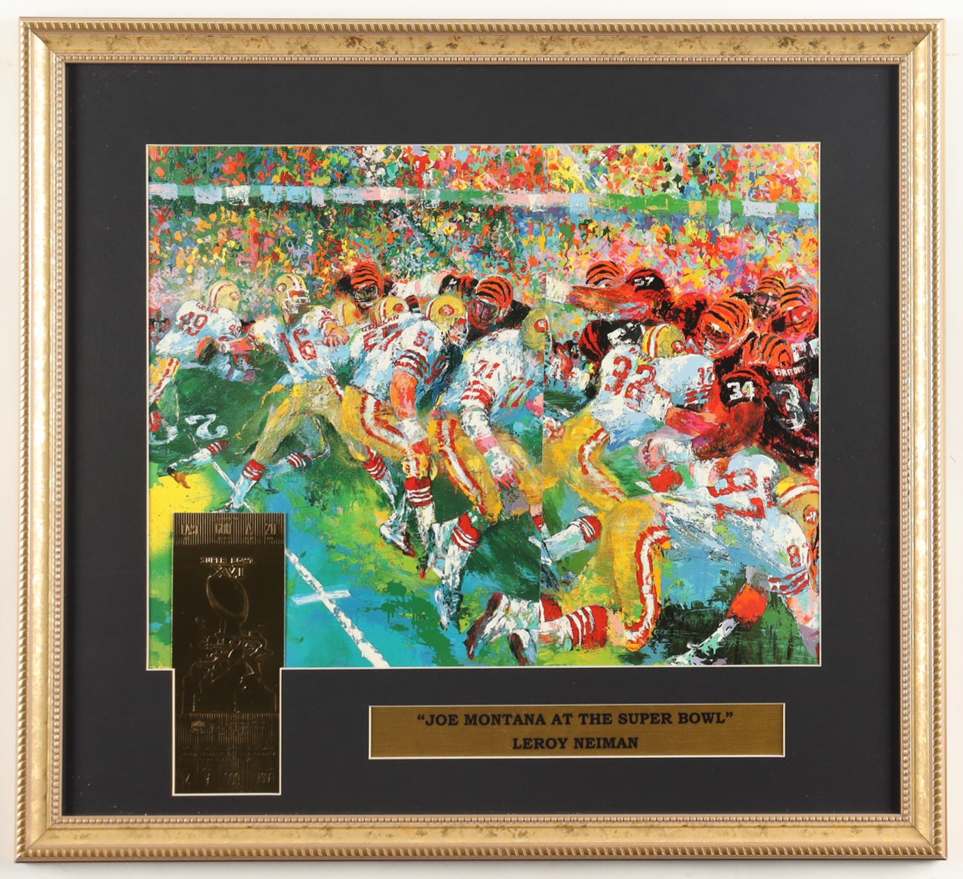 Custom frame measures approximately 20" x 22" in size and features a LeRoy Neiman (D. 2012) art print depicting Joe Montana (HOF). The display also includes an official Super Bowl XVI 23kt gold ticket. Please note, display is unsigned.
