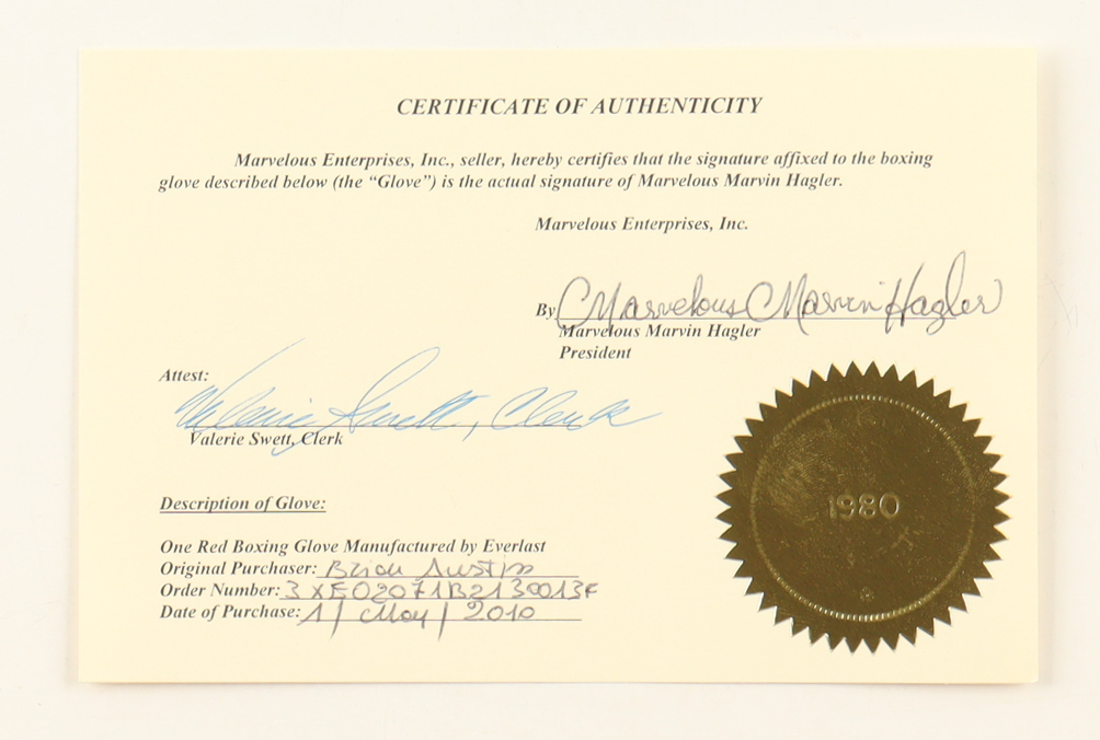 Everlast boxing glove has been hand-signed by Marvin Hagler (D. 2021, HOF). Includes display case as shown.