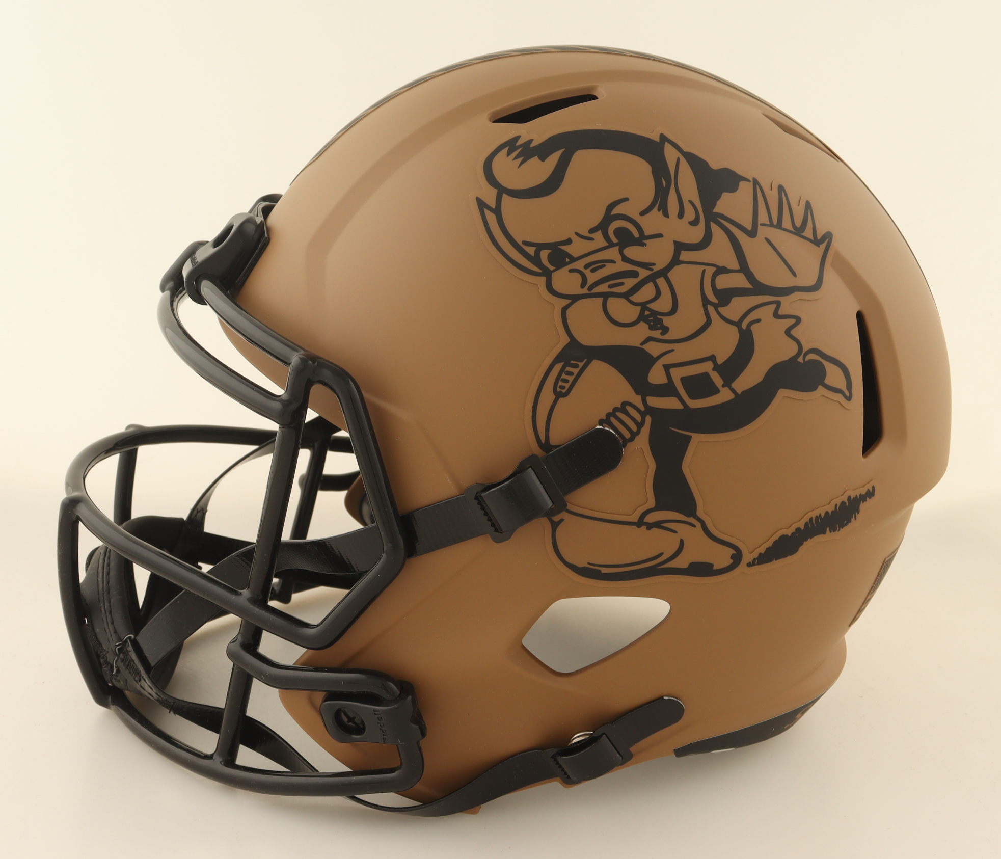 Riddell Cleveland Browns Full-Size Replica Salute to Service Alternate Speed helmet has been hand-signed and inscribed by Ozzie Newsome (HOF).
