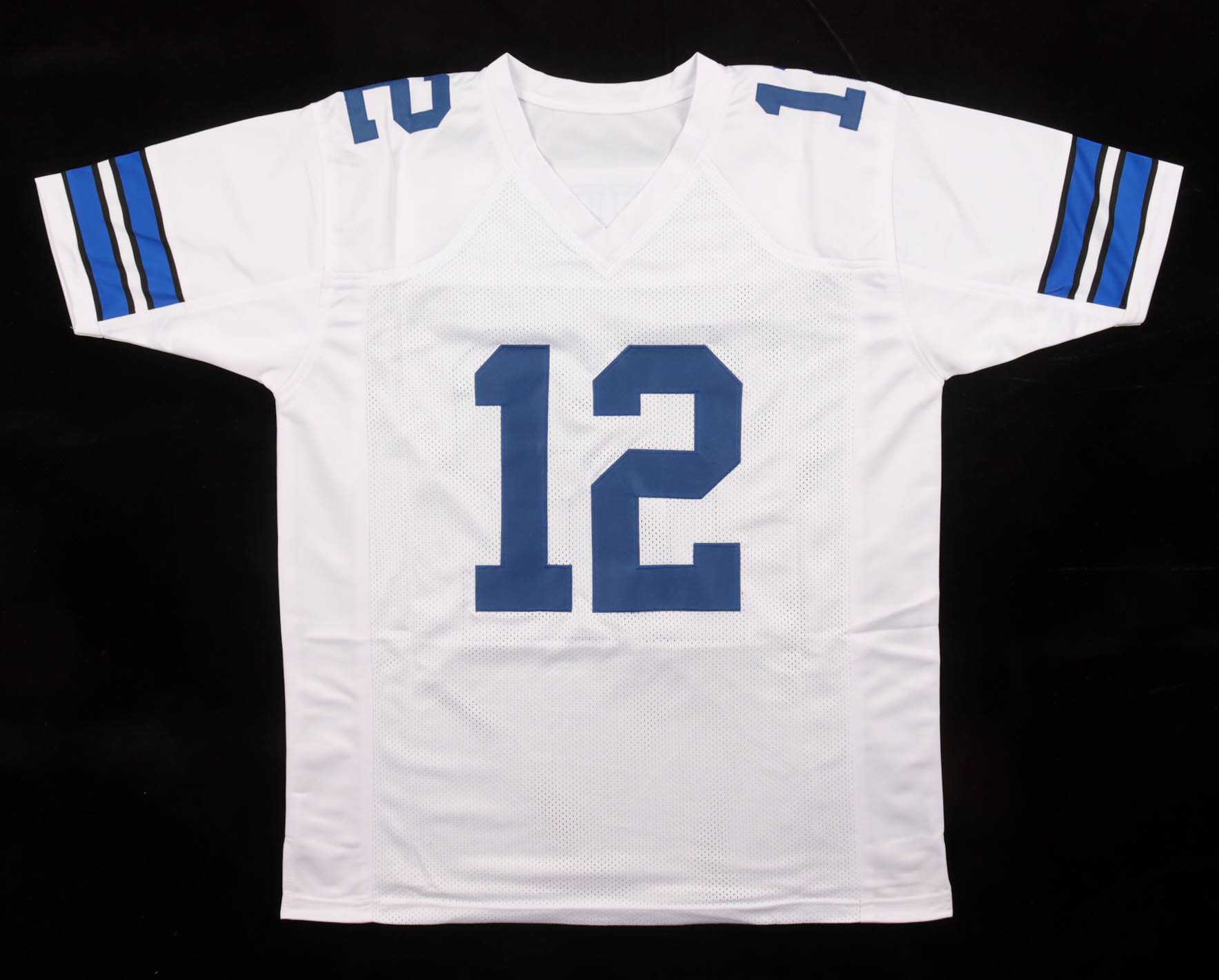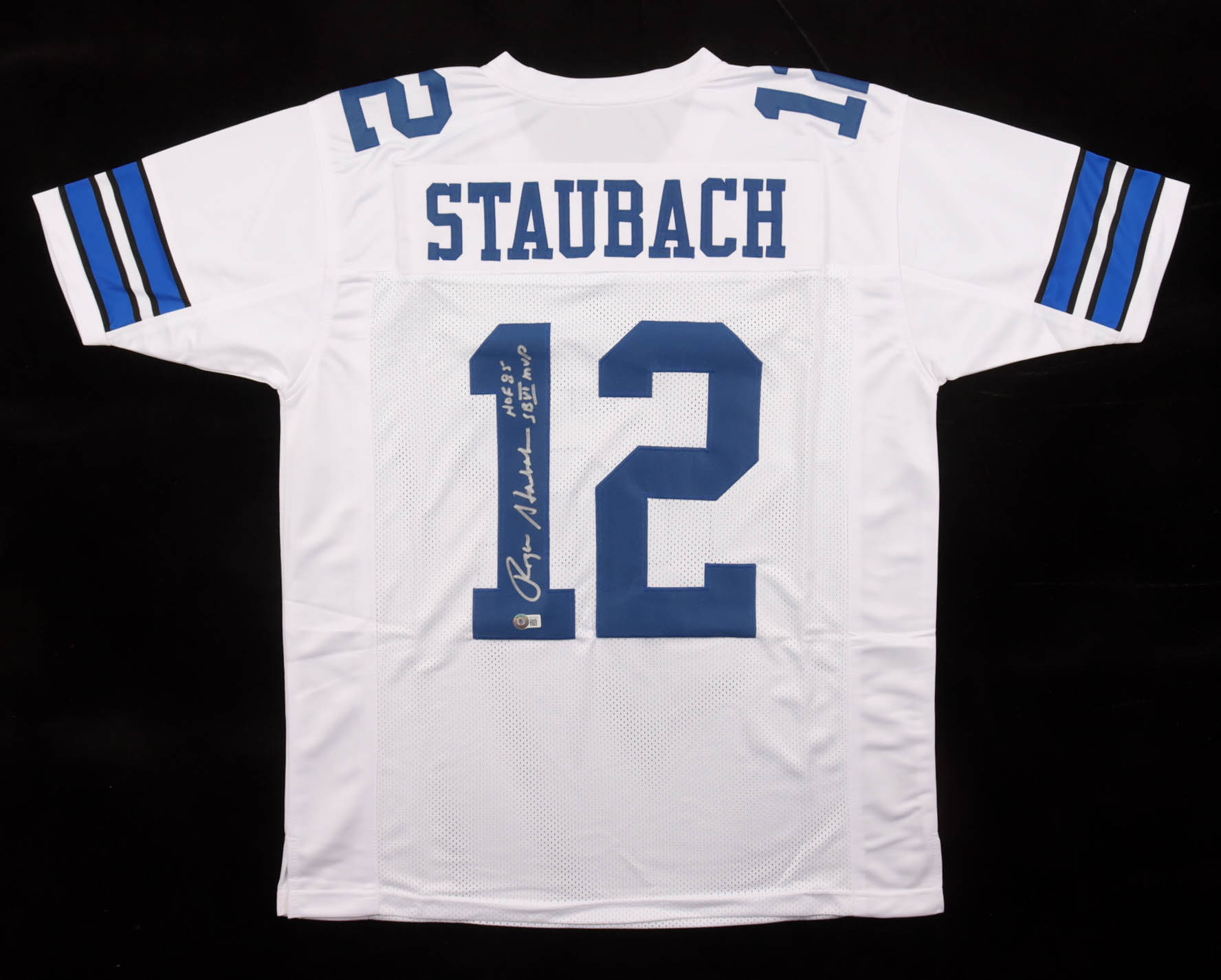 Custom jersey with everything sewn on, size XL. Hand-signed and inscribed by Roger Staubach (HOF).