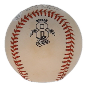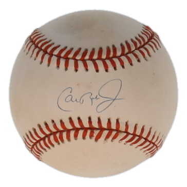 Rawlings Official American League Commemorative Logo Baseball. Hand-signed by Cal Ripken Jr. (Baltimore Orioles, HOF). Please note, the baseball is naturally toned and stained.
