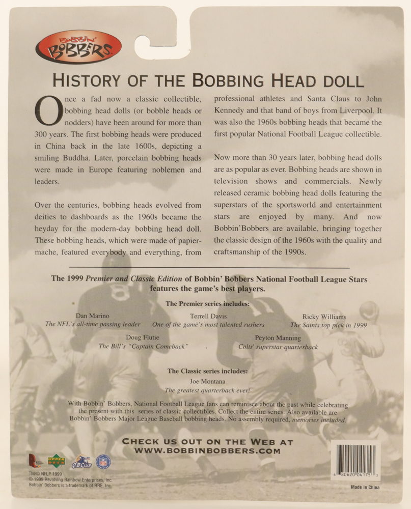 1999 Miami Dolphins Premier Edition "Bobbin' Bobbers" bobble head measures approximately 6" tall and features Dan Marino (HOF). Please note, the bobblehead is unsigned.