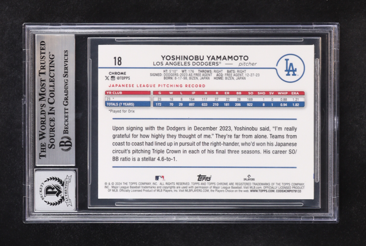 Yoshinobu Yamamoto Signed 2024 Topps Chrome Logofractor #18 RC (BGS | Autograph Graded BGS 10)