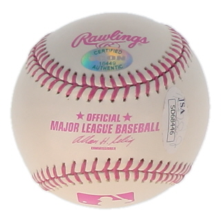 Rawlings Official Major League Breast Cancer Awareness Logo Baseball. Hand-signed and inscribed by Matt Manning (Detroit Tigers). Please note, there are minor stains throughout the baseball.