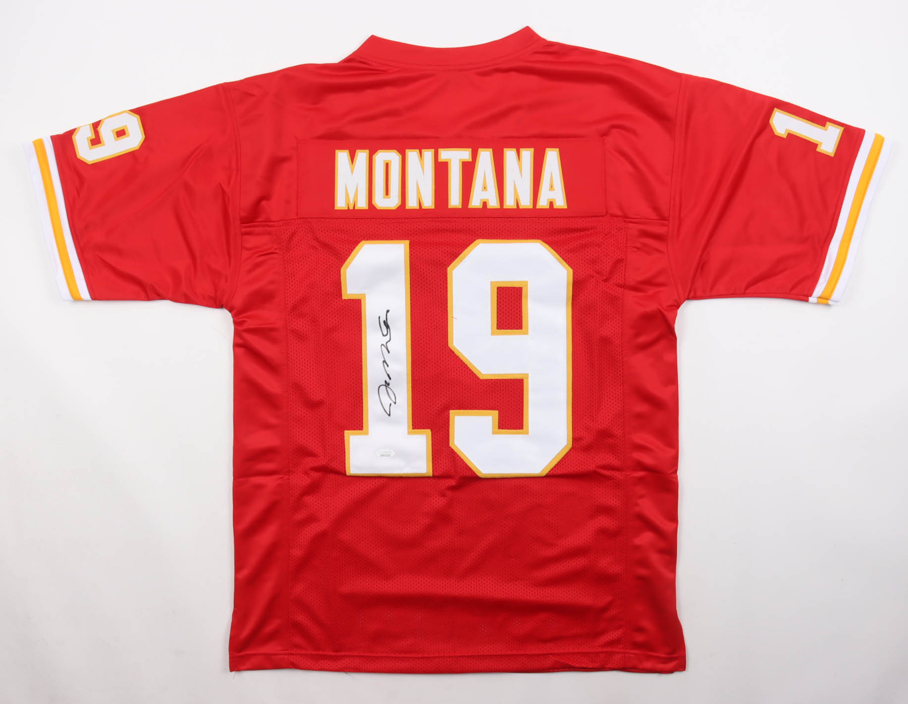 Custom jersey with everything sewn on, size XL. Hand-signed by Joe Montana (HOF).