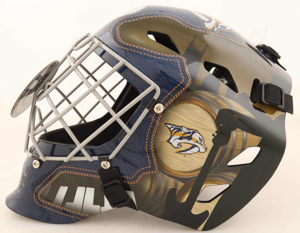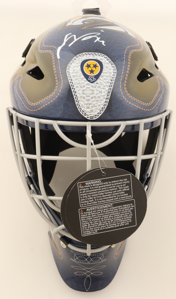 Franklin Nashville Predators full-size hockey goalie mask has been hand-signed by Juuse Saros.