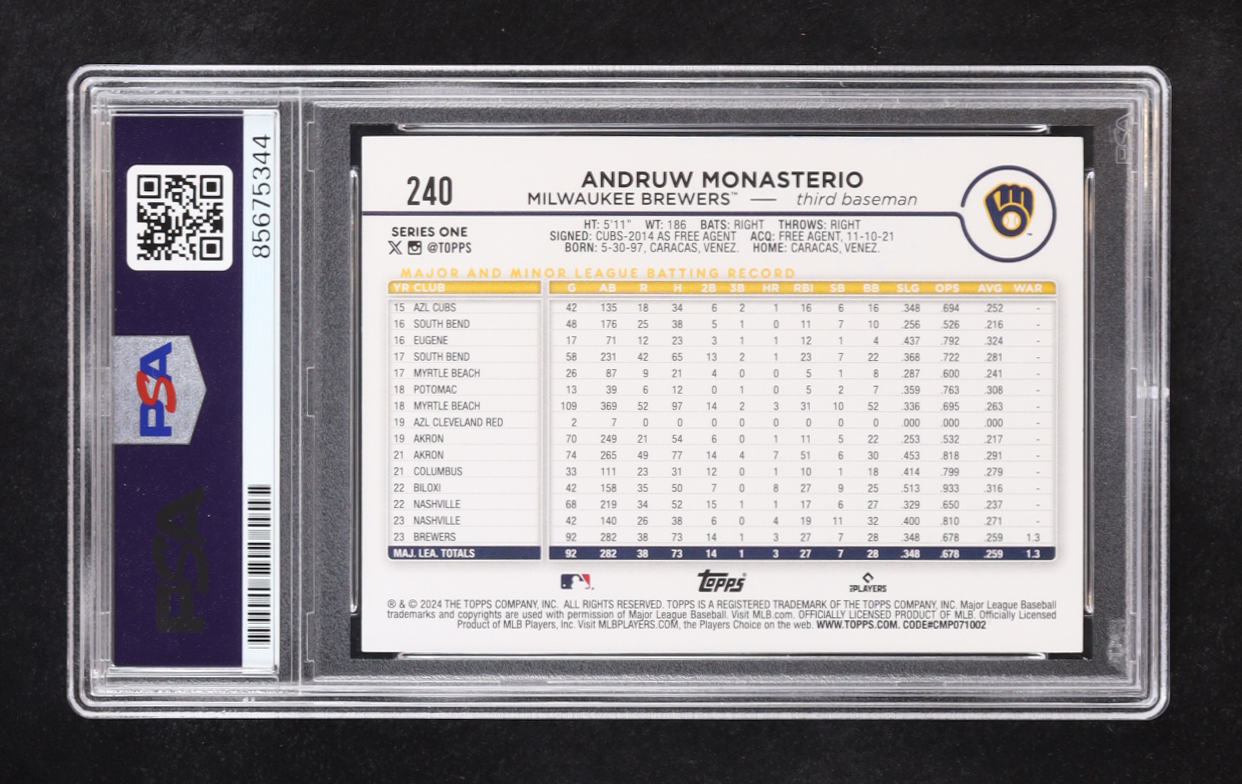 Andruw Monasterio Signed 2024 Topps Series One #240 (PSA | Autograph Graded PSA 10)
