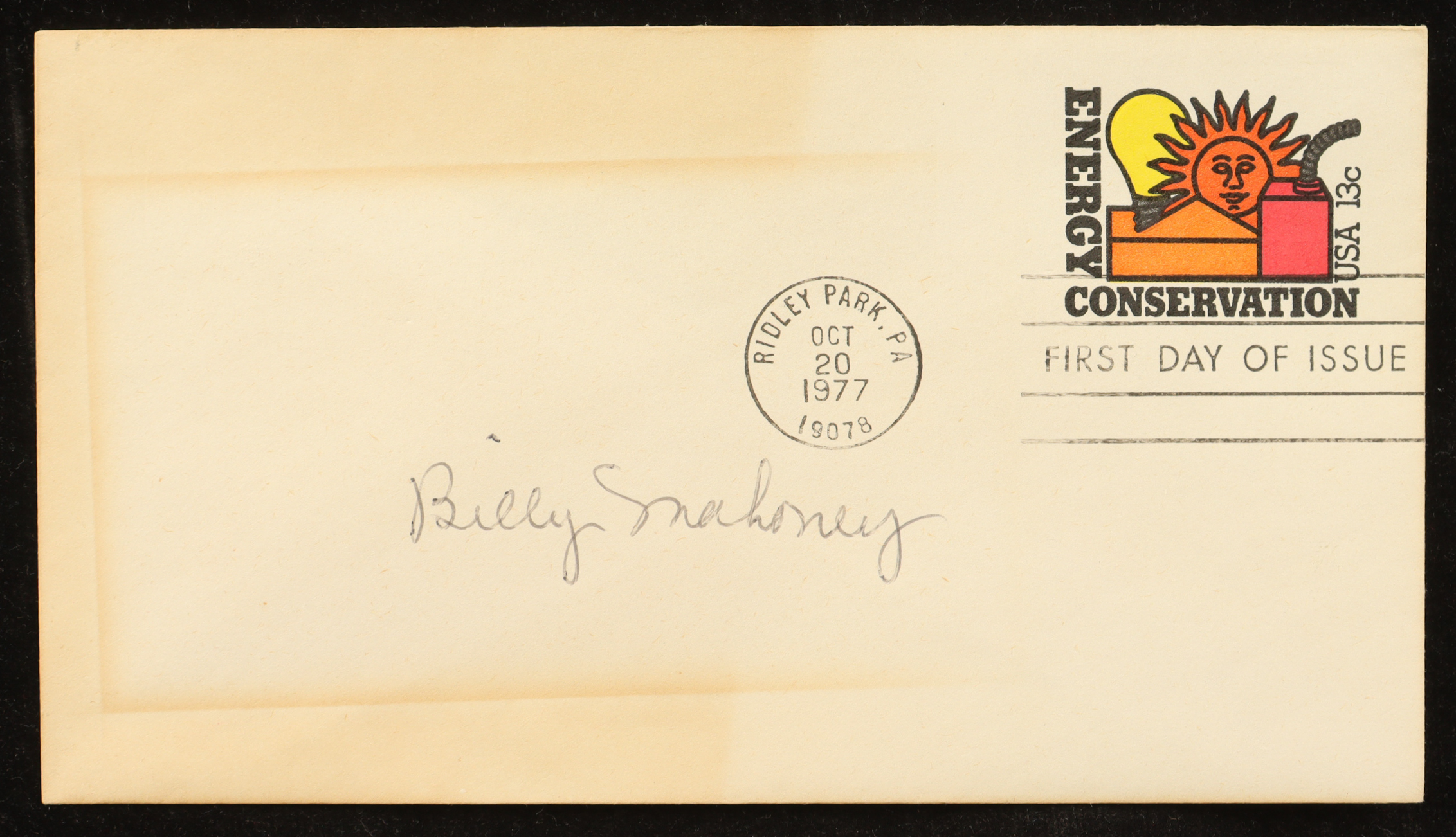 First Day Cover envelope postmarked October 20, 1977 has been hand-signed by Billy Mahoney.