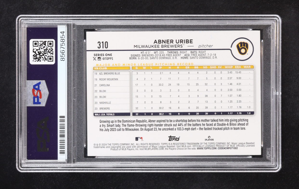 Abner Uribe Signed 2024 Topps Series One #310 RC (PSA | Autograph Graded PSA 10)